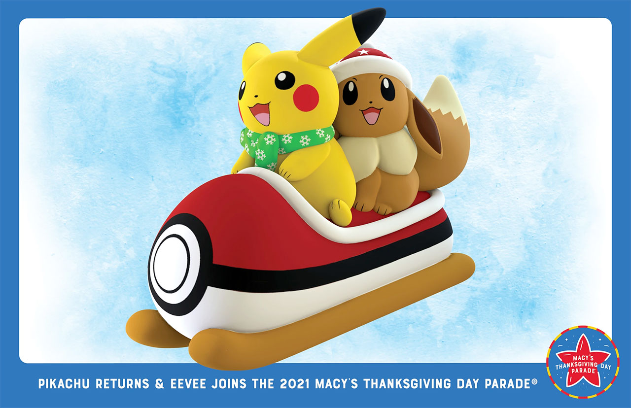 The Pokémon Company International et Macy’s Inc. ont annoncé que Pikachu serait rejoint par Évoli sur le nouveau design du ballon-traîneau en forme de Poké Ball géante pour la Macy’s Thanksgiving Day Parade 2021.