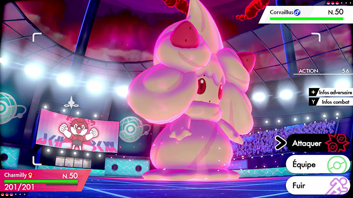 La crème qui s’écoule de son corps se durcit lorsque Charmilly subit un impact direct. Plus le coup est fort, plus la crème durcit, ce qui donne à Charmilly une incroyable résistance aux attaques physiques. De plus, les décorations qui ornent le corps de Charmilly sont dures comme le diamant. Autant dire qu’il est difficile d’outrepasser ses défenses. Charmilly propulse des missiles de crème ultra-calorique sur ses adversaires. Tout Pokémon atteint par ces missiles se sentira euphorique et plein d’énergie, mais tombera aussi dans un état de confusion totale. Les capacités de type Fée que connaît Charmilly Gigamax se transforment en Cure G-Max, qui soigne tous les Pokémon alliés de Charmilly et inflige des dégâts à un ennemi.