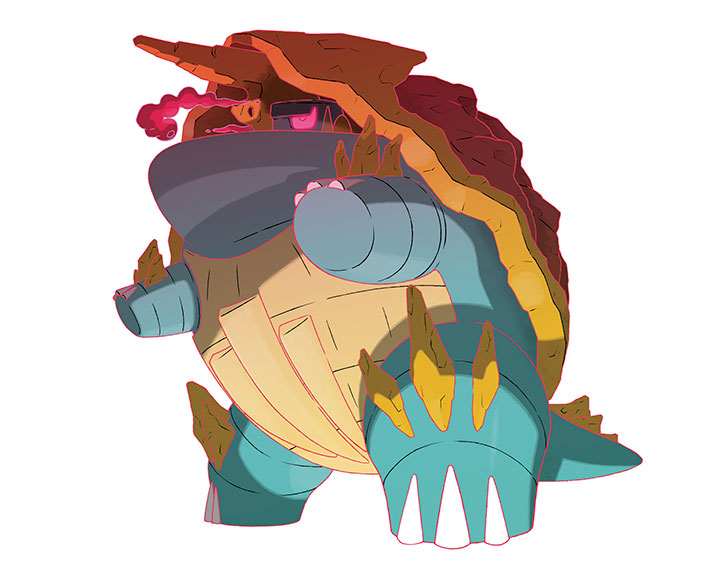 Grâce au pouvoir du Gigamax, Torgamord peut désormais se tenir sur ses deux pattes arrière. En se tenant debout, il peut s’effondrer de tout son poids sur les Pokémon adverses et les écraser. Torgamord a tendance à protéger son cou dans sa carapace, mais il peut l’étirer rapidement quand il attaque. Ses mâchoires sont surpuissantes et peuvent aisément détruire des structures métalliques. La force de ses mâchoires combinée à la propulsion de son cou permet à Torgamord de littéralement transpercer les montagnes en une seule attaque. Les capacités de type Eau que connaît Torgamord Gigamax se transforment en Récif G-Max. En plus d’infliger des dégâts, Récif G-Max disperse des rochers coupants autour des adversaires, ce qui blessera tous les Pokémon rejoignant le combat.