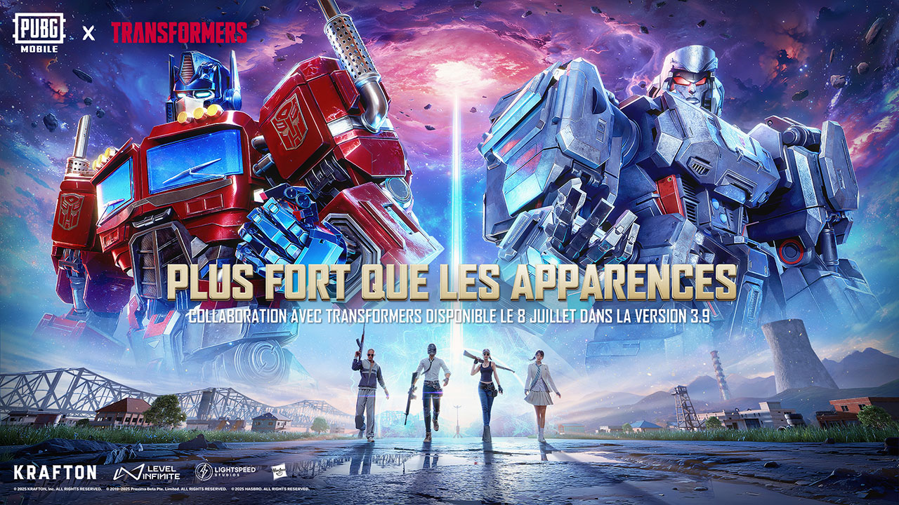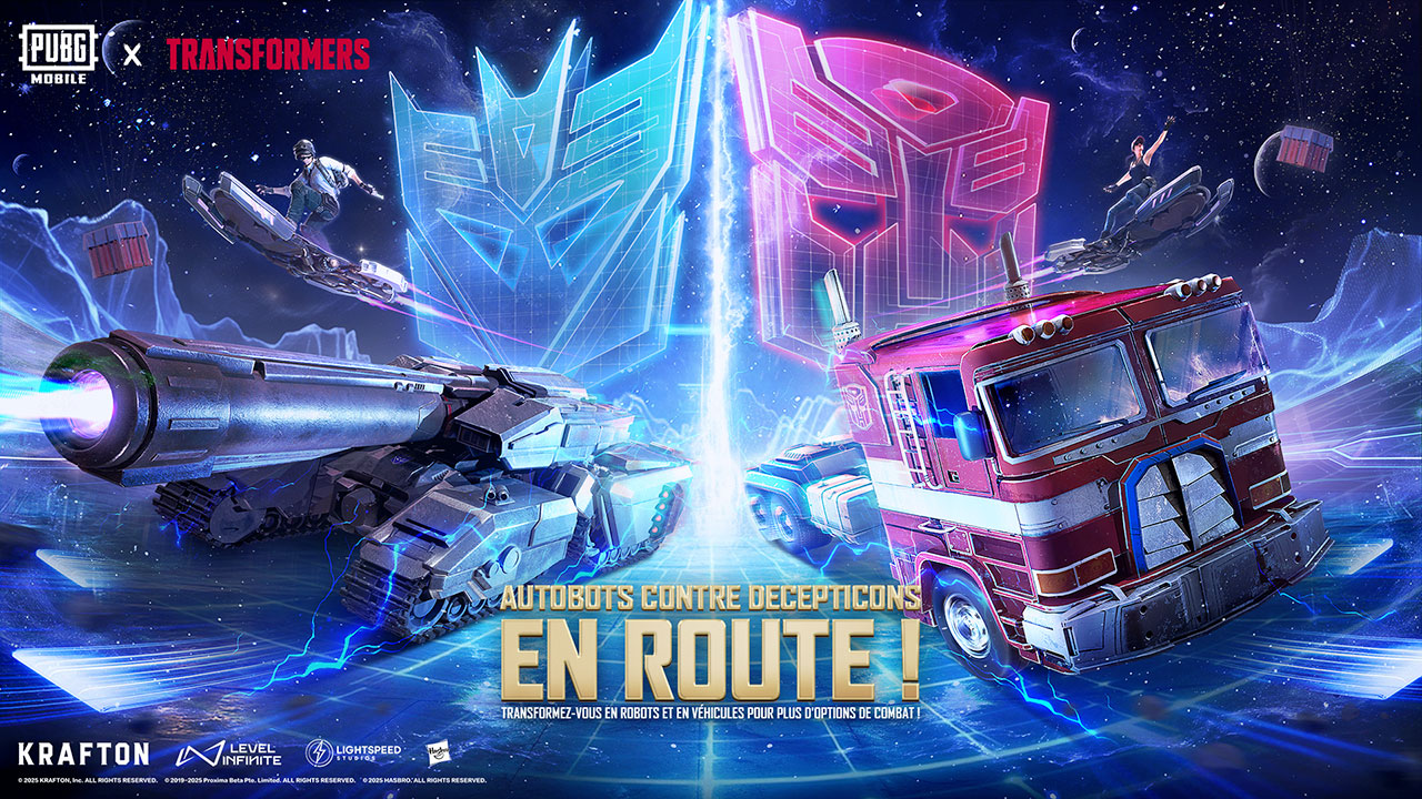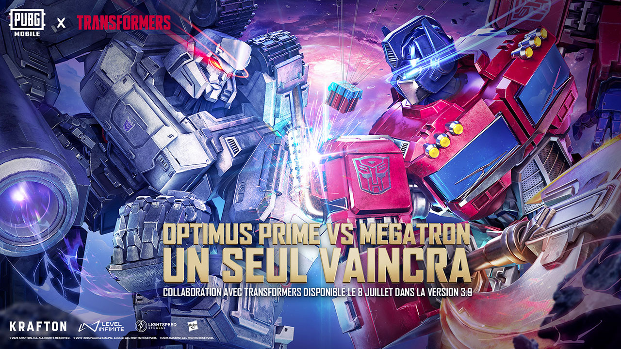 La Version 3.9 intègre la franchise emblématique TRANSFORMERS sur les champs de bataille avec un nouveau mode à thème, permettant aux joueurs de vivre une expérience inédite aux côtés des légendaires Autobots et Decepticons. À partir du 8 juillet, les joueurs peuvent invoquer Optimus Prime ou Megatron en utilisant la Balise de Cybertron, ou appeler des Caisses de Cybertron remplies de fournitures et d’Energon. Chaque robot TRANSFORMERS peut se transformer en véhicule ou robot, avec des capacités uniques, et les joueurs peuvent collecter de l’Energon pour les améliorer et débloquer des compétences ultimes puissantes, telles que le Heurt Chargé d’Optimus Prime ou la Rafale de Fusion de Megatron. Quand les deux rivaux se rencontrent, une arène spéciale apparaît sur Erangel pour un duel épique ; si Optimus Prime est mis à terre avant le début du duel, les joueurs peuvent le ranimer pour que le combat continue. À la fin de chaque match, les robots TRANSFORMERS font des animations spéciales et laissent des récompenses. En dehors des parties, les joueurs peuvent choisir leur camp, Optimus Prime ou Megatron, et accomplir des missions pour débloquer des récompenses exclusives, comme l’animation spéciale d’Optimus Prime sur l’écran de résultats. Ils peuvent visiter la Météorite Cosmique pour une performance spéciale, recevoir un dispositif cybertronien avec affichage de date unique, réclamer un pack de ravitaillement cybertronien, et essayer le nouveau Hoverboard Cosmique, offrant des fonctionnalités de mobilité avancées. En plus de ce gameplay spectaculaire lancé le 8 juillet, les joueurs peuvent rester à l’affût d’autres véhicules, objets et bien plus encore sur le thème TRANSFORMERS – dès le 18 juillet dans PUBG MOBILE.