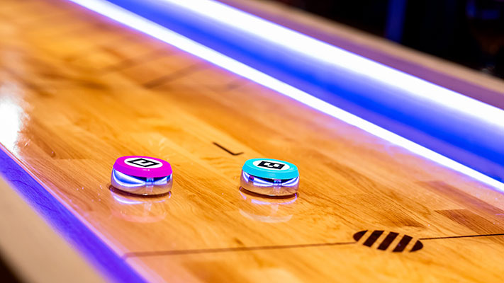 Nul besoin de connaître les règles, l’entrée en matière est des plus intuitive et le concept est simple : faire glisser le palet sur une longue planche d’érable et viser juste afin de marquer un maximum de points. Stratégie, placement ou percuter les pucks dess adversaires seront de mise !