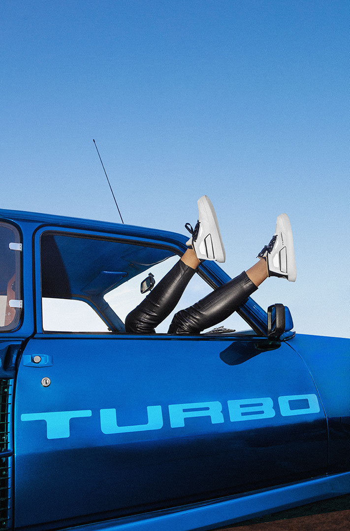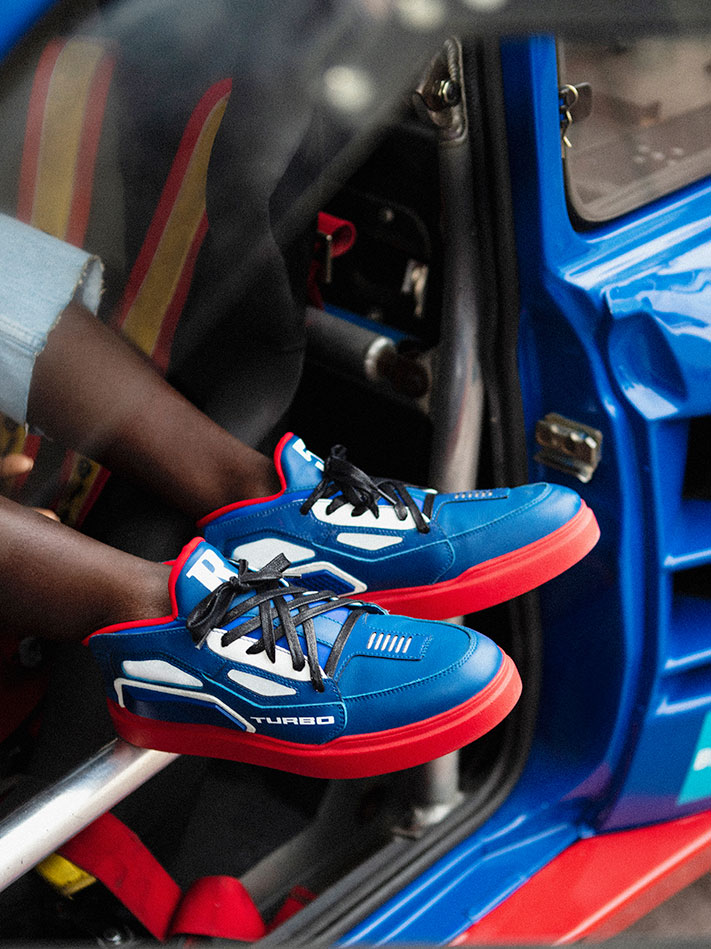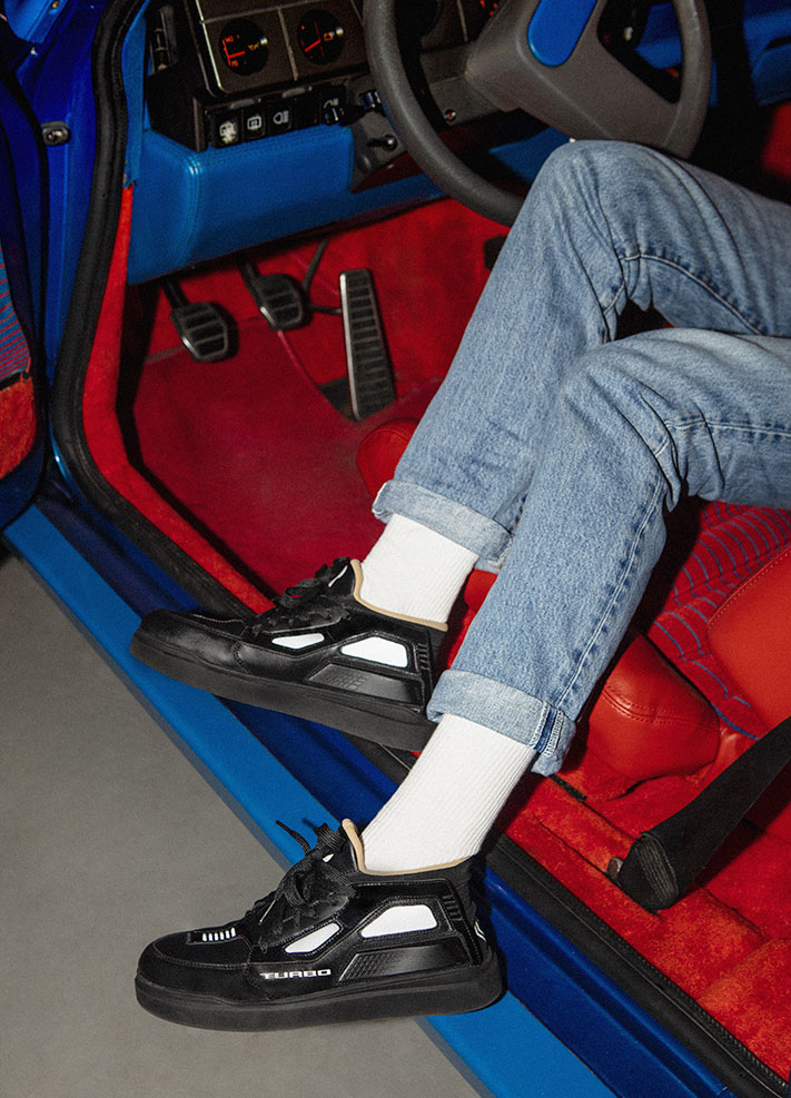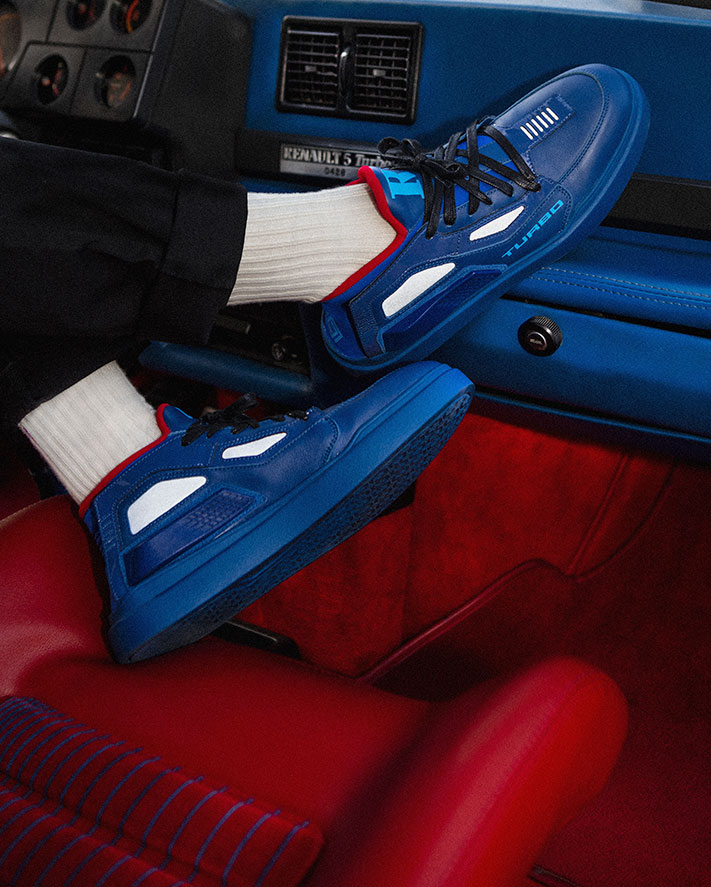 Renault et Savoir-Faire Paris mêlent ici leurs univers et transposent pour la première fois sur une basket, les éléments typiques de l’emblématique R5 Turbo : l’inclinaison arrière du modèle fait référence au châssis de la voiture ainsi que les aérations latérales, l’intérieur des paires est inspiré de la scellerie et les lacets reprennent les ceintures de sécurité.