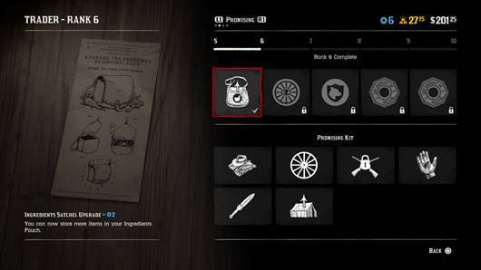 Lorsque vous déverrouillez un rang de rôle, vous obtenez des jetons et parfois de nouvelles compétences, comme celle de se baisser à cheval pour esquiver une attaque (chasseur de primes) ou d’entraîner votre chien à vous avertir d’une attaque de bandits (marchand), ou une contenance de sacoche accrue ou l’accès à des évènements spécifiques au rôle en mode exploration. Chaque niveau offre également un ensemble d’objets liés au rôle, à déverrouiller avec des jetons afin de pouvoir être achetés.