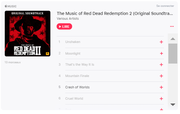Nous sommes ravis d’annoncer que The Music Of Red Dead Redemption 2: Original Soundtrack est disponible en précommande dès aujourd’hui, et que « Crash of Worlds », par Rocco DeLucca, et « Table Top », par Daniel Lanois, sont disponibles en téléchargement pour toute précommande. Cette bande-son originale sera disponible en format numérique le 12 juillet 2019, en collaboration avec Lakeshore Records. Vous pouvez la précommander depuis iTunes ici, et écouter Crash of Worlds et Table Top sur Spotify dès maintenant.