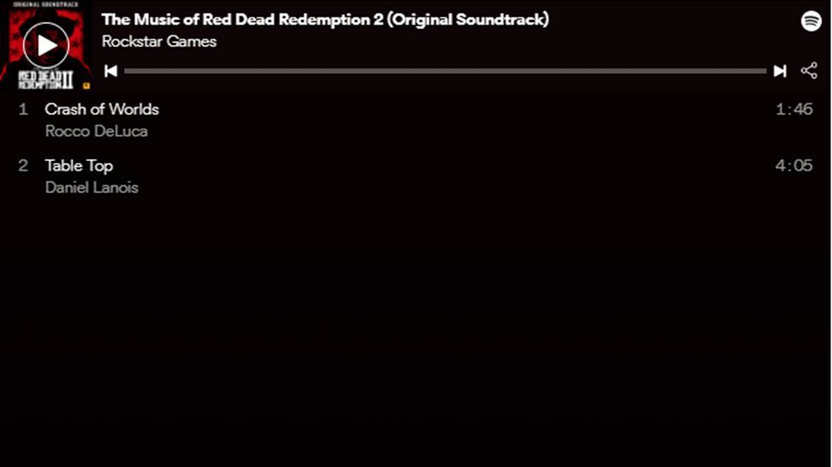 Nous sommes ravis d’annoncer que The Music Of Red Dead Redemption 2: Original Soundtrack est disponible en précommande dès aujourd’hui, et que « Crash of Worlds », par Rocco DeLucca, et « Table Top », par Daniel Lanois, sont disponibles en téléchargement pour toute précommande. Cette bande-son originale sera disponible en format numérique le 12 juillet 2019, en collaboration avec Lakeshore Records. Vous pouvez la précommander depuis iTunes ici, et écouter Crash of Worlds et Table Top sur Spotify dès maintenant.