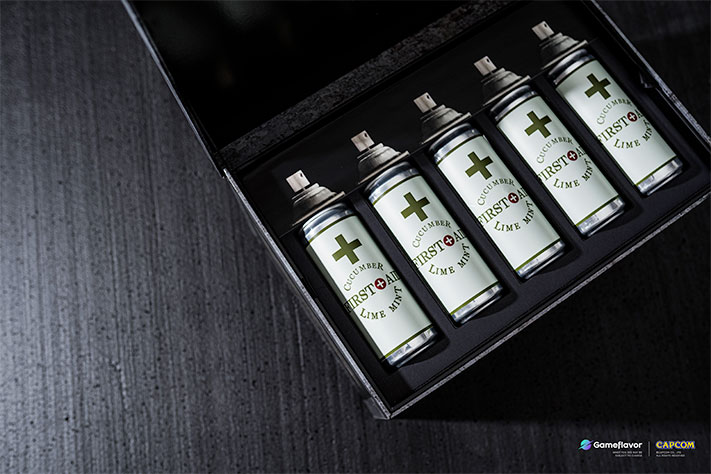 « Lors de la création d’objets à collectionner, Il est essentiel de capter l’essence de l’objet en jeu et ainsi, faire en sorte de le retranscrire dans le produit réel. » a déclaré Michael Codd, PDG de GameFlavor. « Cela signifie qu’il faut reproduire l’aspect, l’odeur ET le goût pour que tous les fans de Resident Evil découvrent un produit identique à ce qu’ils avaient imaginé, ici le Spray de premier secours de Resident Evil.»