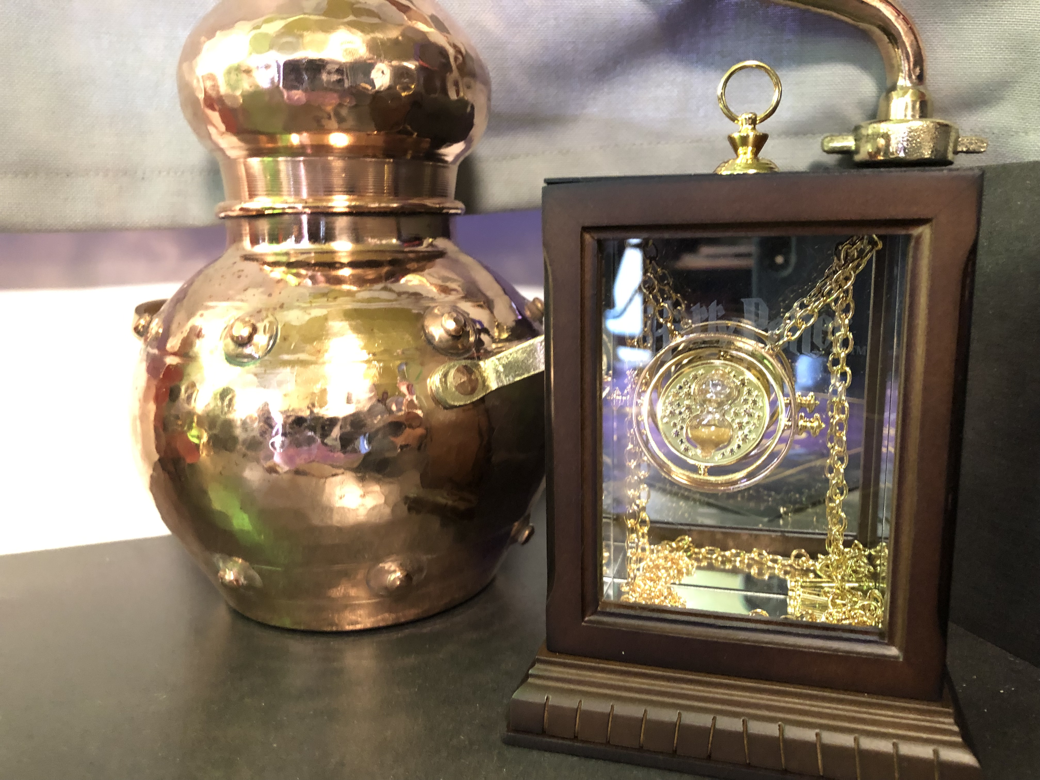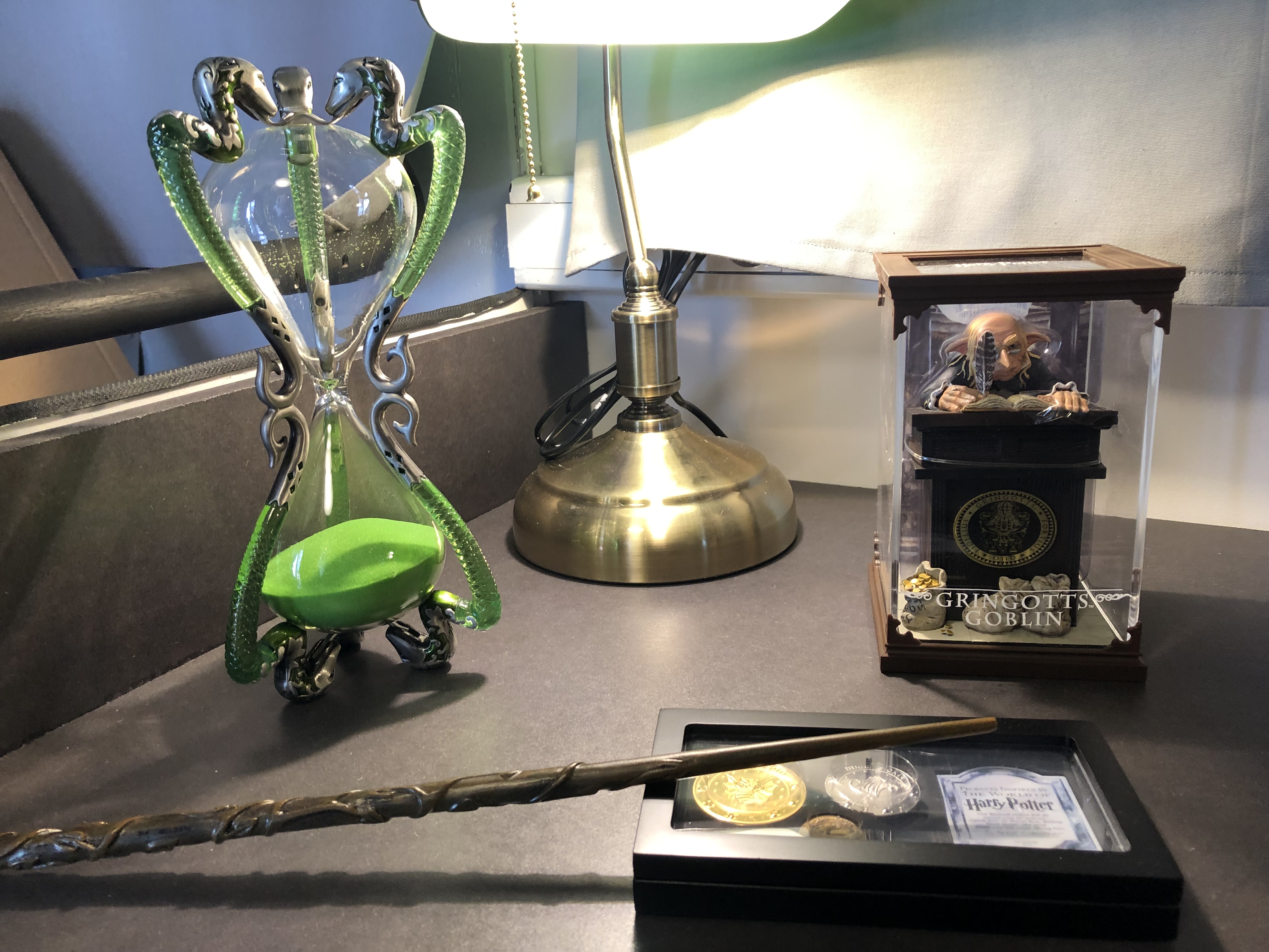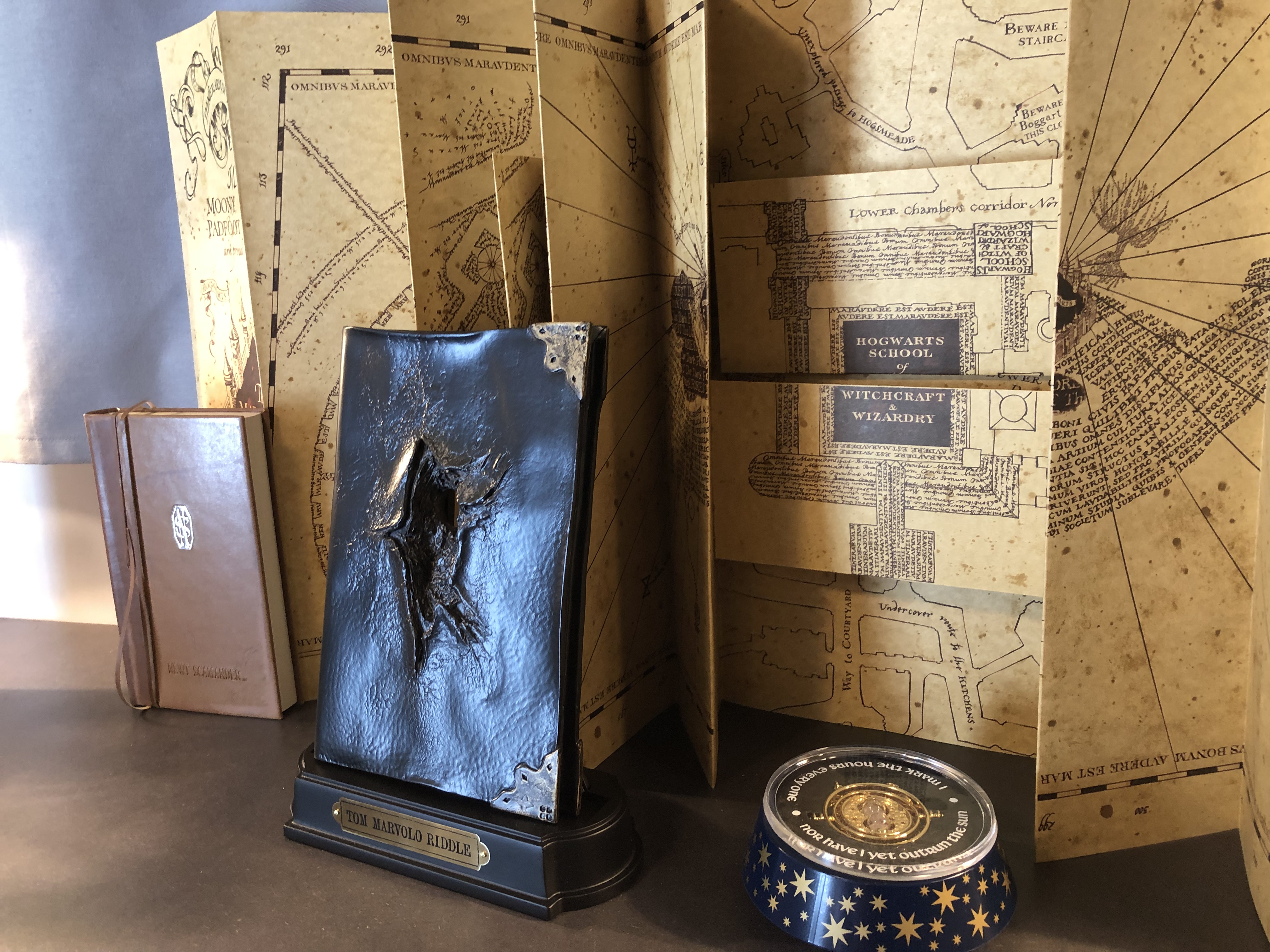 À l’intérieur du Magicobus, l’espace était assez étroit (tel que l’on peut l’imaginer dans le livre et le film) et était décoré de quelques accessoires du film disponibles dans la boutique officielle Wizarding World : l’œuf de la coupe de feu, la pierre philosophale, un chocogrenouille, la canne de Lucius Malefoy, le retourneur de temps, la carte du maraudeur, le journal de Jedusor… Au fond du bus, un niffleur vous attendait sur le lit afin de passer au 3ème photocall !