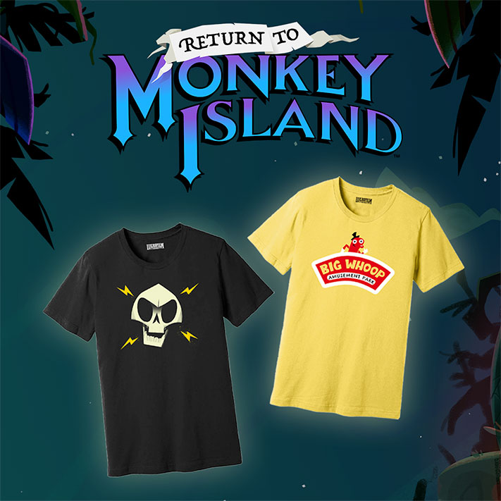 Vous voulez des chemises ? Il y en a en stock ! Drapez-vous des couleurs de l’infâme pirate fantôme LeChuck, du vendeur de bateaux Sam T. Stanman, du crâne démoniaque Murray ou du célèbre parc d’attractions Big Whoop pour égayer vos habituels dîners mondains d’un nouveau style pas piqué des hannetons.