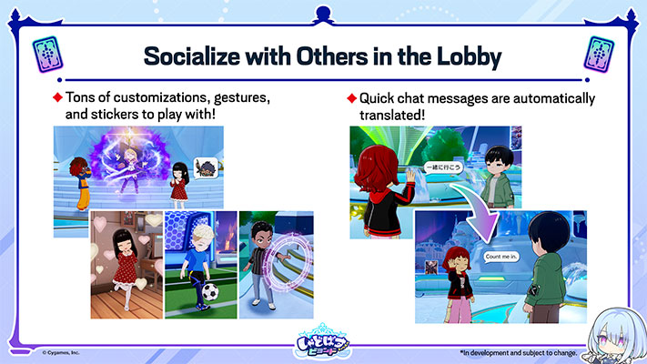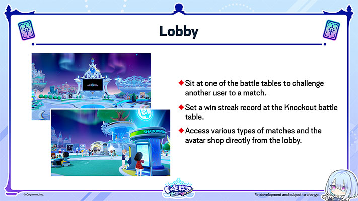 En plus des combats, les joueurs peuvent utiliser leur avatar personnalisable dans le lobby pour communiquer avec d’autres joueurs du monde entier via des messages instantanés, des gestes et des stickers.