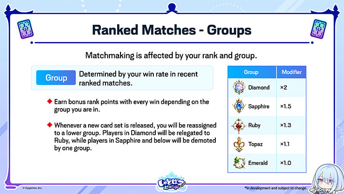 Les groupes sont une nouvelle fonctionnalité de Shadowverse: Worlds Beyond, déterminée par le taux de victoires récent des joueurs et qui fluctue au fil du temps. Les joueurs commencent dans le groupe « Emerald », puis progressent dans les groupes « Topaz », « Ruby », Sapphire », puis « Diamond » à mesure que leur taux de victoires s’améliore. Cependant, ces groupes sont partiellement réinitialisés à chaque saison.