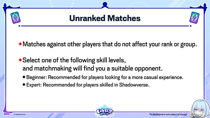 Comme dans le jeu Shadowverse original, les classements sont déterminés en fonction des RP, ou « rank points ». Les joueurs progressent du niveau « Beginner » au niveau « Master », des niveaux supérieurs tels que « Grand Master » étant prévus dans de futures mises à jour.