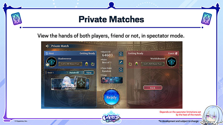 Les matchs privés génèrent des identifiants que les joueurs peuvent partager à des adversaires spécifiques afin de les affronter. Les joueurs peuvent également assister au match en utilisant le même identifiant. Dans Shadowverse: Worlds Beyond, l’hôte d’un match privé peut aussi autoriser les spectateurs à voir les mains des deux joueurs, même si ces derniers ne figurent pas dans leur liste d’amis.