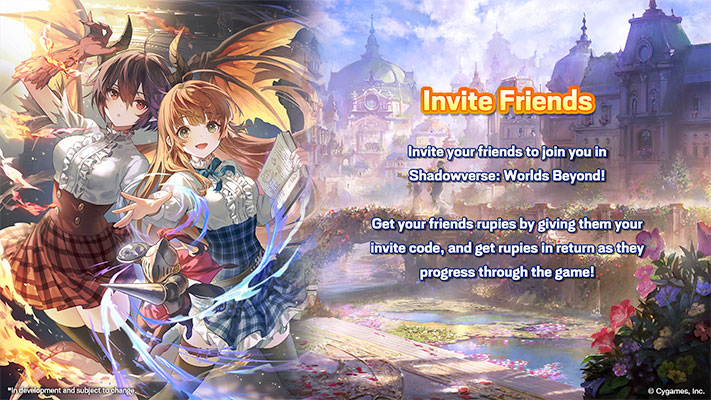 Invitez vos amis à jouer à Shadowverse: Worlds Beyond et gagnez des rupies en fonction de leur progression. Vos amis recevront également des rupies rien qu’en utilisant votre code d’invitation. Cet événement sera permanent après la sortie du jeu.