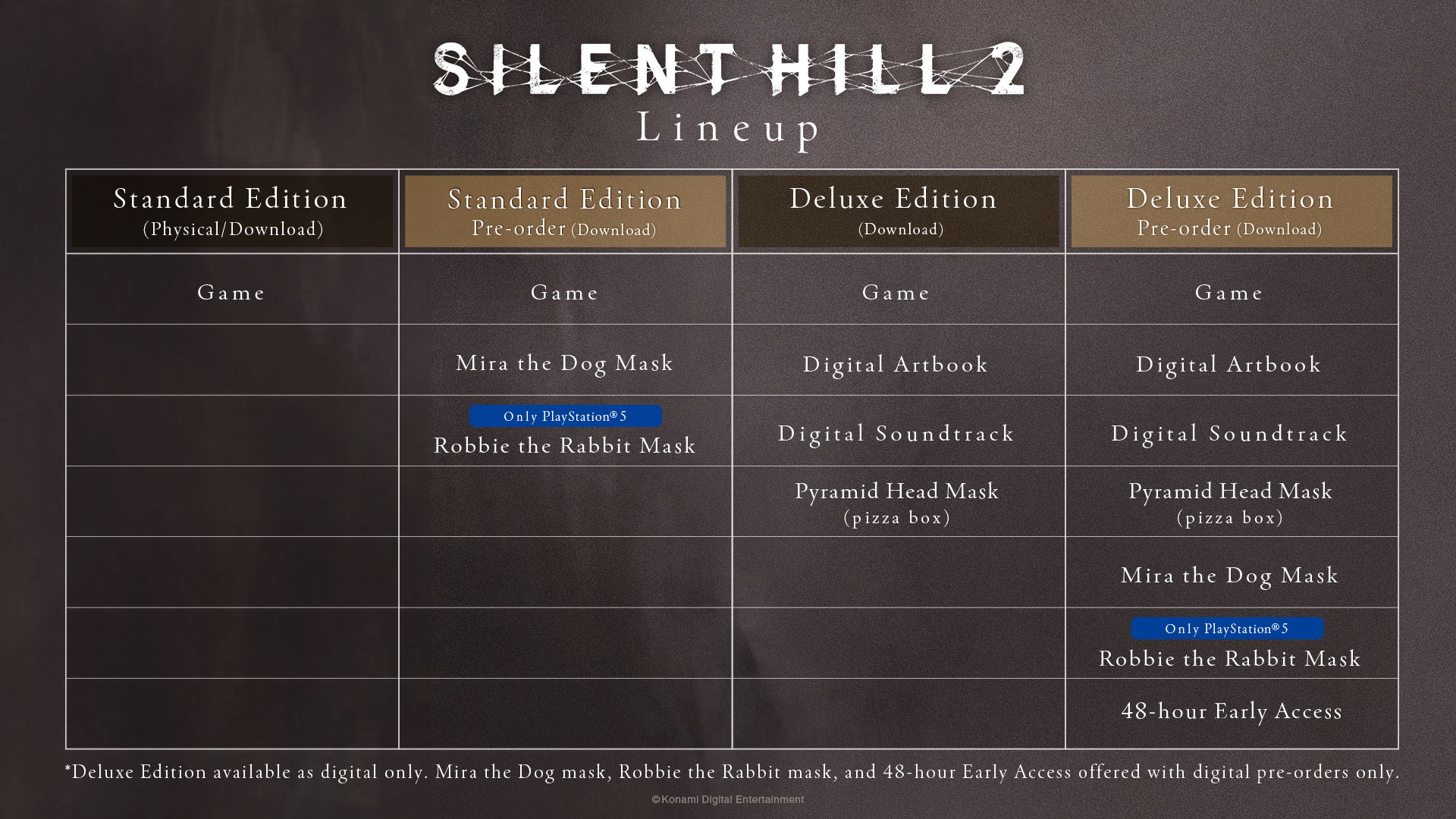 Les joueurs peuvent précommander les éditions physique et numériques de Silent Hill 2. Des bonus exclusifs de précommande numérique seront inclus dans les versions Standard et Deluxe du jeu.