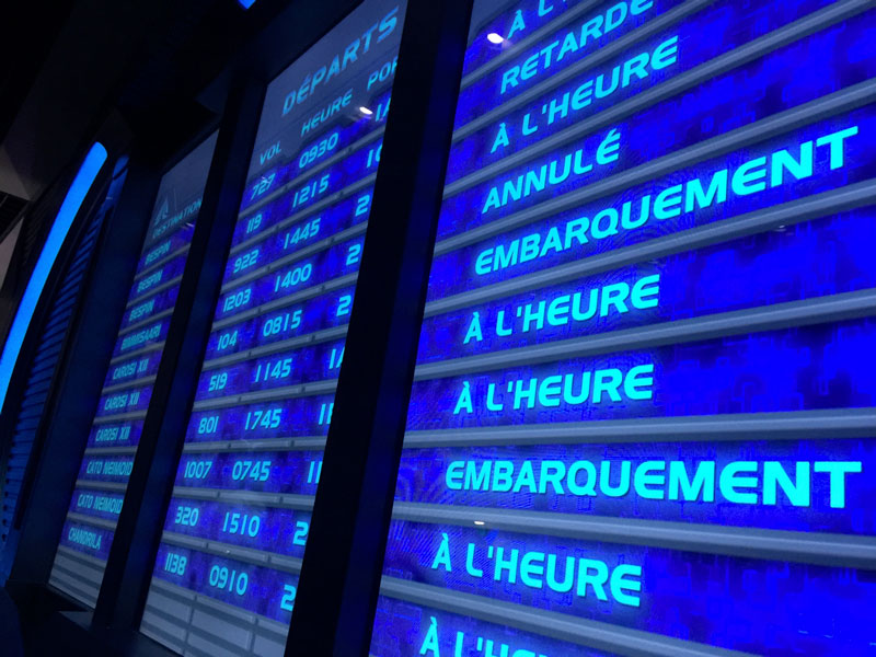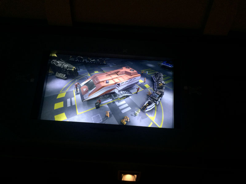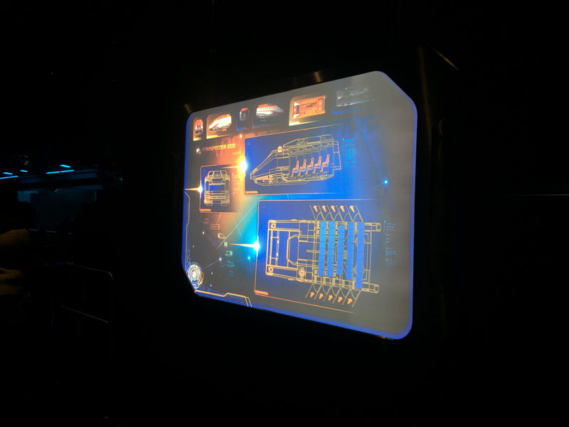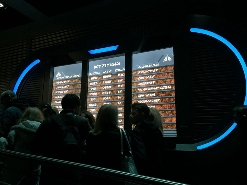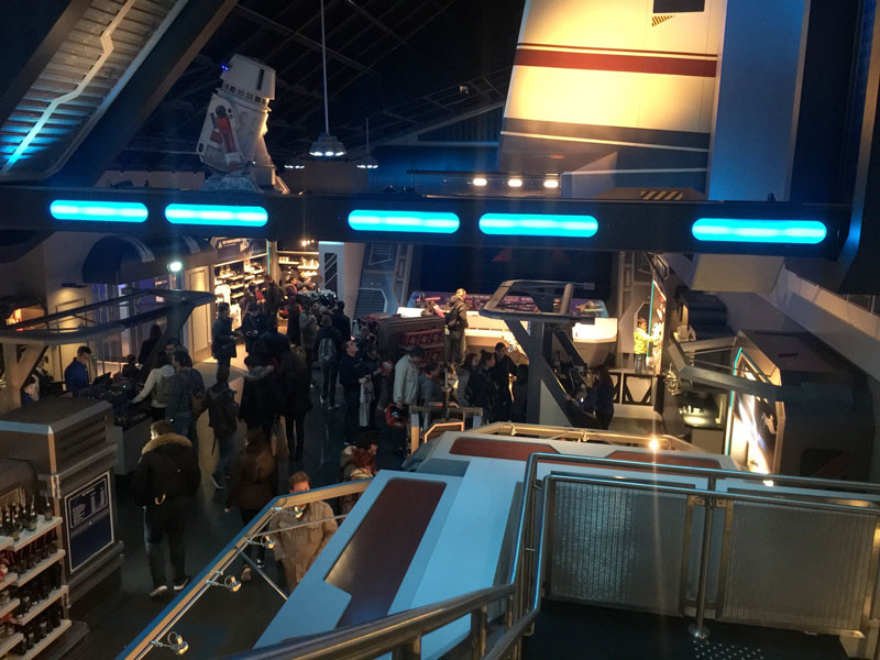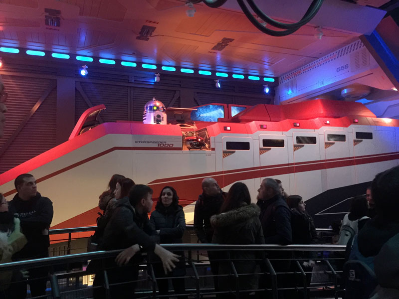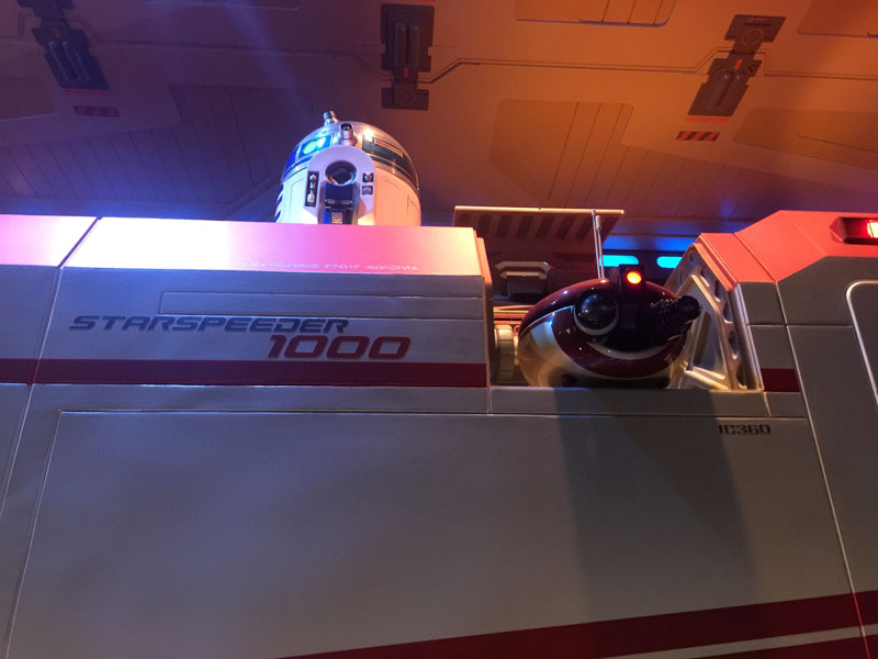 La devanture de l’attraction a été rénovée et le célèbre X-Wing a été déplacé au dessus de l’ancienne boutique, qui abrite désormais une salle de rencontre (Dark Vador était alors présent lors de notre visite). Le parcours pré-attraction reste le même mise à part quelques mise à jours tels que des panneaux d’affichages indiquant les différentes destinations, l’écran géant présentant le voyage de l’Endor Express présente désormais la compagnie Star Tours et ses différentes destinations ainsi que la météo des planètes. Et pour finir, le Star Speeder 1000 qui prend la place du Star Speeder 3000, toujours équipé d’une unité D2 mais celui-ci est accompagné d’un nouveau droïde « 3D ». De nouveaux droïdes animées sont présent dans la seconde salle, où l’on peut voir notre bon vieux Rex dans un sale état près à être recyclé.