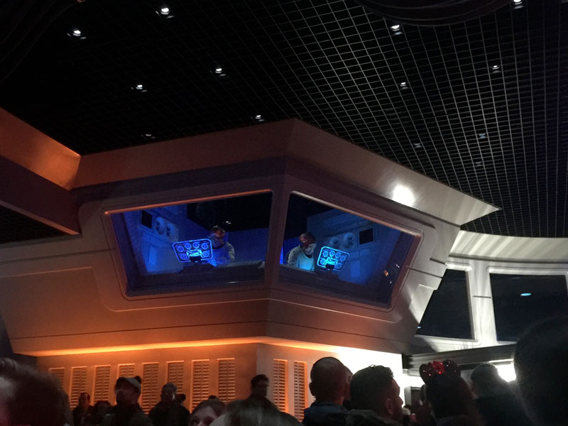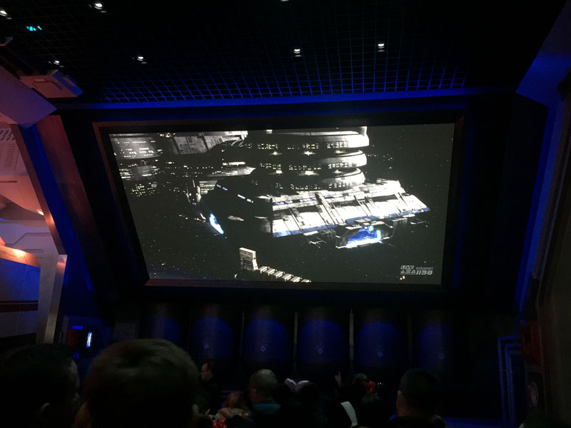 Le voyage commence par un contrôle de l’empire qui cherche un espion rebel dans le vol, un membre de la cabine apparait ainsi sur l’écran de droite. S’en suit une fuite qui mènera vers une folle aventure. Ce sont plus de 70 combinaisons de parcours que vous pourrez effectuer avec cette nouvelle version de Star Tours. Pour notre part, nous sommes tombé sur Hoth, la bataille de Coruscant ainsi que la ceinture d’astéroïdes de Géonosis. Ce sont aussi deux héros différents qui nous ont indiqué le chemin à suivre durant l’aventure. La 3D n’est pas franchement renversante mis à part les apparitions holographiques et les objets qui viennent s’accrocher ou heurter le pare-brise du Star Speeder.