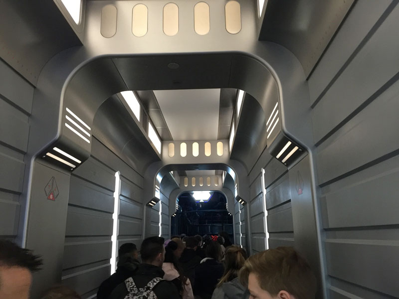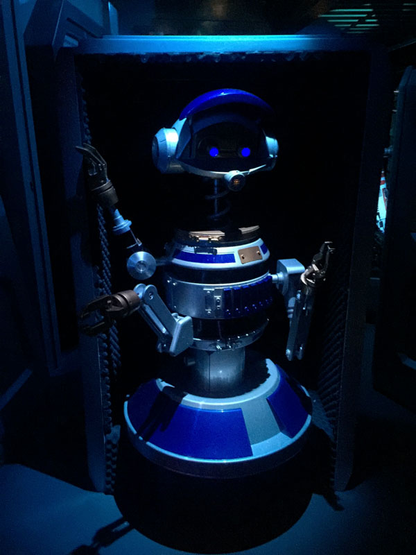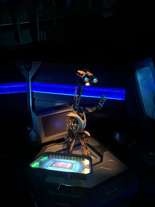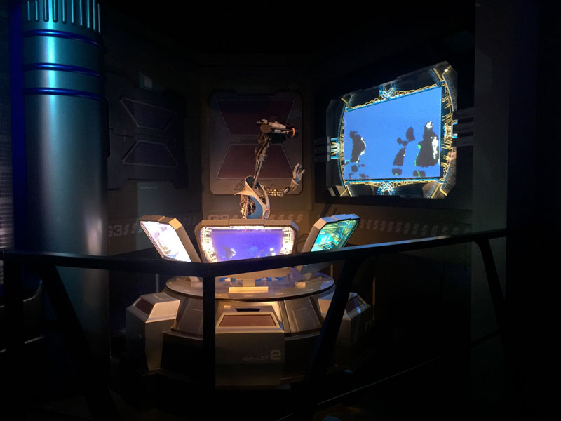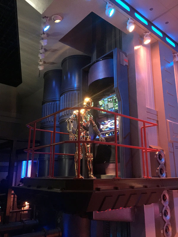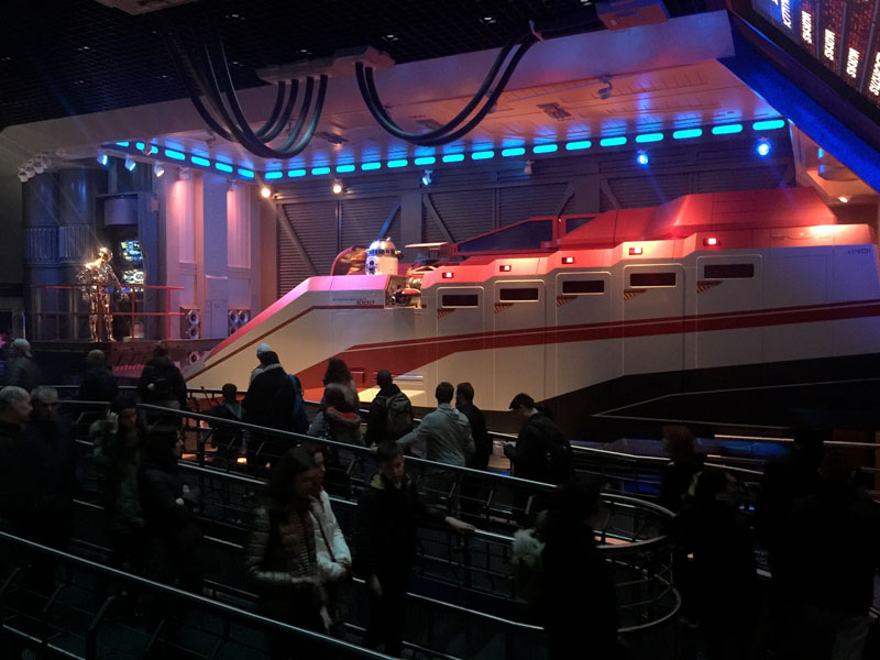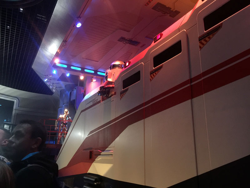 La devanture de l’attraction a été rénovée et le célèbre X-Wing a été déplacé au dessus de l’ancienne boutique, qui abrite désormais une salle de rencontre (Dark Vador était alors présent lors de notre visite). Le parcours pré-attraction reste le même mise à part quelques mise à jours tels que des panneaux d’affichages indiquant les différentes destinations, l’écran géant présentant le voyage de l’Endor Express présente désormais la compagnie Star Tours et ses différentes destinations ainsi que la météo des planètes. Et pour finir, le Star Speeder 1000 qui prend la place du Star Speeder 3000, toujours équipé d’une unité D2 mais celui-ci est accompagné d’un nouveau droïde « 3D ». De nouveaux droïdes animées sont présent dans la seconde salle, où l’on peut voir notre bon vieux Rex dans un sale état près à être recyclé.