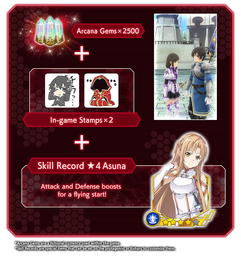 Tous les utilisateurs pourront obtenir 2 500 Arcana Gems, deux types de timbres in-game et un record de compétence Asuna 4 étoiles en se connectant au jeu après sa sortie. Afin de fêter les pré-inscriptions mondiales, les utilisateurs pourront également obtenir des avatars de l’ouest et de l’est après avoir commencé le jeu. Pré-inscrivez-vous maintenant pour obtenir les dernières nouvelles concernant la sortie du jeu.