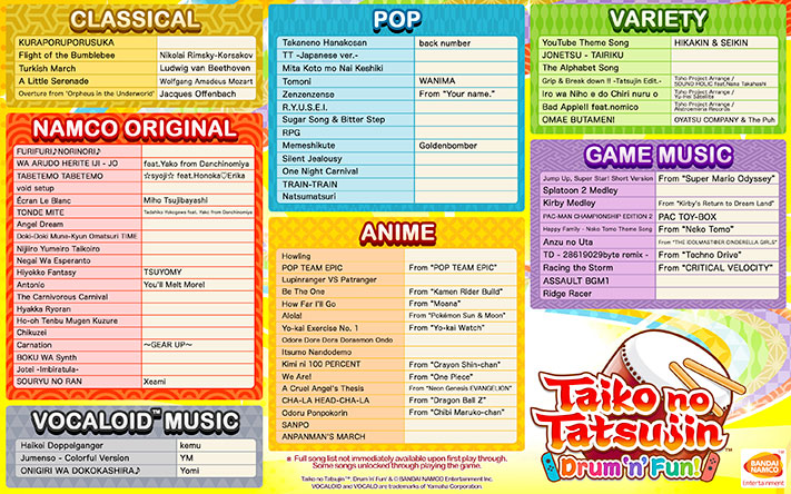 Bandai Namco Entertainment Europe a dévoilé la liste des chansons présentes dans les jeux Taiko no Tatsujin: Drum ‘n’ Fun! et Taiko no Tatsujin: Drum Session!