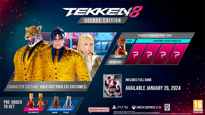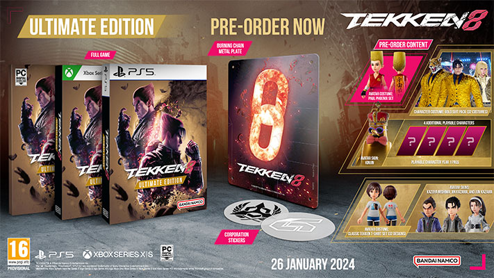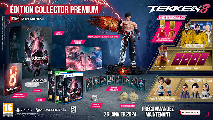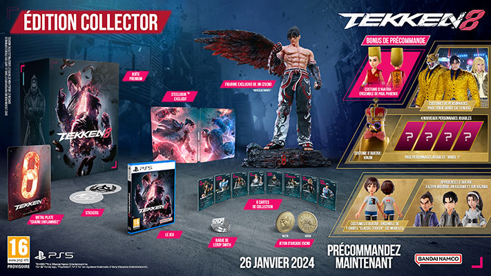TEKKEN 8 est maintenant disponible en précommande en édition Standard, Deluxe et Ultimate. Les précommandes pour l’édition Standard incluent le jeu de base, une fois disponible, et offrent aux joueurs l’ensemble Paul Phoenix, en costume d’avatar. Les joueurs PlayStation 5 recevront les skins Mokujin et Testujin Avatar. L’édition Deluxe comprend tous les objets standard ainsi que le Pass Année 1 qui débloque quatre personnages qui seront disponibles plus tard après le lancement du jeu, ainsi que le skin Kinjin Avatar. Il comprend également le Pack de Costumes Dorés les 32 personnages, permettant aux joueurs d’apporter du bling-bling à leurs combats. L’édition Ultimate comprend tout le contenu et les bonus de l’édition Deluxe, ainsi que des skins d’Avatar pour Kazuya, Jin et Jun, ainsi que 32 modèles de T-shirts TEKKEN classiques, pour que les joueurs puissent personnaliser leurs avatars et peut-être revivre des souvenirs passés avec cette franchise légendaire.