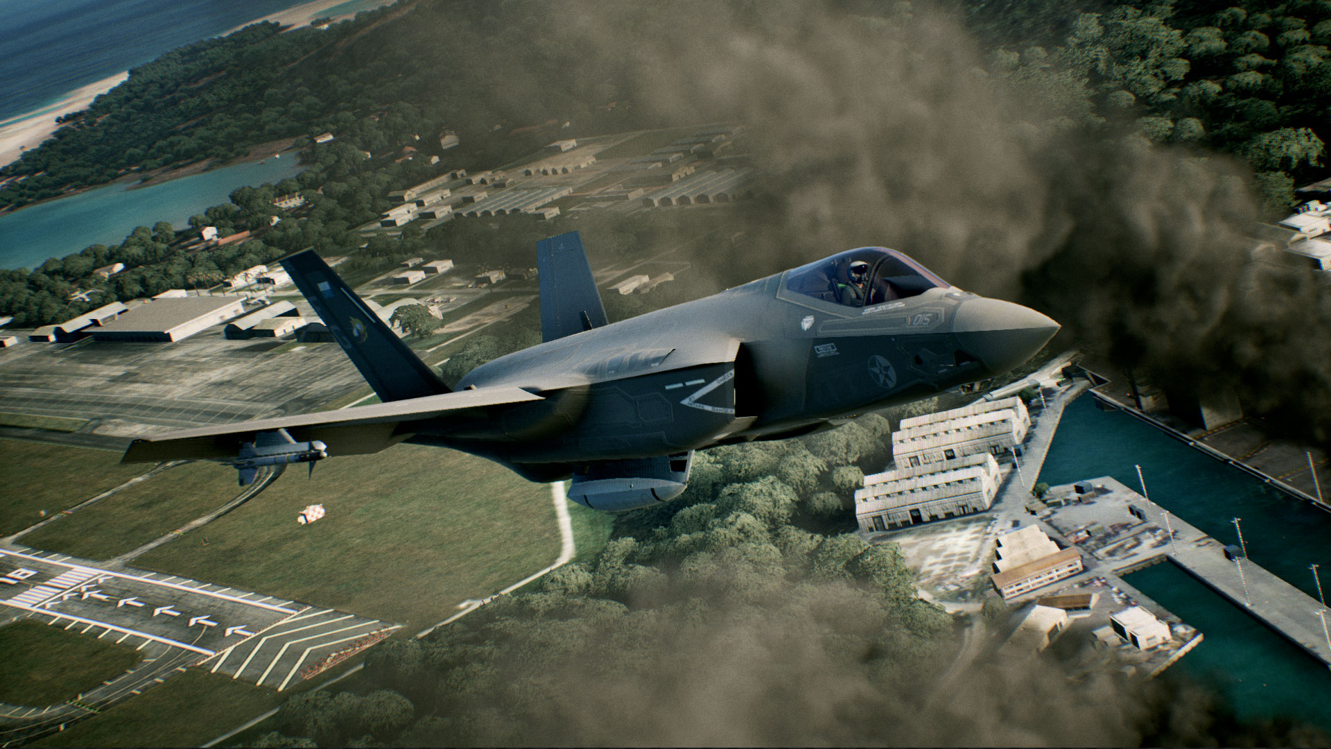 Première réaction, c’est magnifique ! Le travail graphique via le moteur Unreal Engine 4 est fabuleux. Que ce soit dans la modélisations des avions ou dans le soucis des détails des décors, tout est pratiquement parfait. Pour la première fois dans un Ace Combat, les éléments au sol ont été détaillés. En rase-motte on peut facilement distinguer les villes, les usines et les forêts. Ce ne sont plus des amas de pixels comme on a pu le voir dans certains opus précédents. Les détails vont même jusqu’au gouttes de pluie et au givre quand nous sommes dans le cockpit.