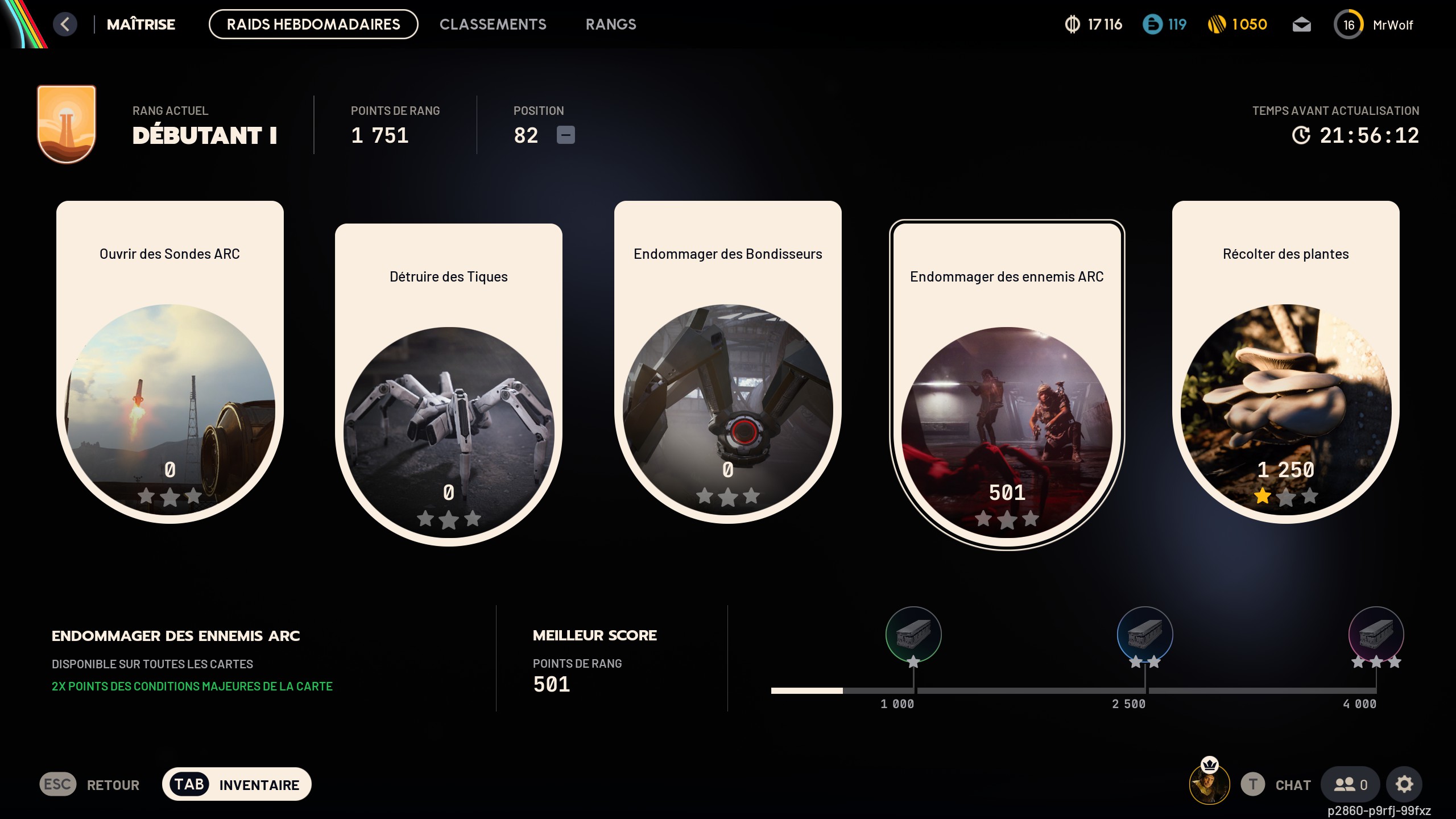 Une fois au niveau 15, vous débloquerez les épreuves, ce sont des défis comme détruire le plus de robots du style frelon ou autres, récolter le plus de plantes ou champignons ou ouvrir un nombre de sondes arc. En accomplissant les actions demander vous allez gagner des points et plus vous aurez de point plus vous passerez les différents palier qui donnerons acces à des récompense. Pour exemple un de mes défis est de récolter des plantes, le 1er palier est a 1000 points, le suivant a 2500 et le dernier a 4000. Je gagnerai une récompense de niveau 1 en atteignant les 1000 points, une récompense de niveau 2 au 2500 points et une récompense de niveau 3 en arrivant au 4000 points. Le système est simple et permet de gagner des récompenses sans vouloir prendre trop de risque.
