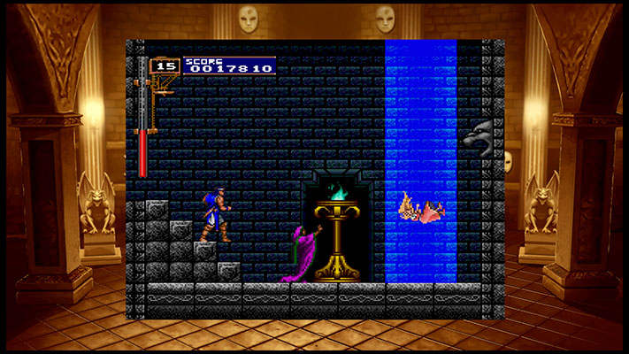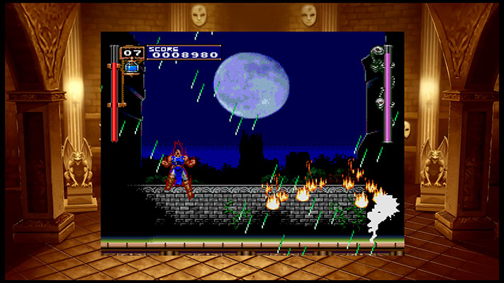 A l’instar des compilations rétrogaming récemment sortis, Castlevania Requiem propose les jeux originaux au format 4:3 accompagné d’un fond d’écran modifiable parmi plusieurs modèles. Des options pour ajouter les lignes de balayage comme dans nos vieux écrans cathodiques sont disponibles. Cependant, passé la nostalgie, elles se révèlent n’être d’aucune utilité. Une option de lissage est également disponible pour camoufler le trop-plein de pixels à l’écran. Les rétrogamers à l’ancienne ne passeront pas par cette option, celle-ci est réservée aux grands écrans où aux joueurs plus jeunes (moins tolérants) qui décident d’explorer l’univers de la saga.