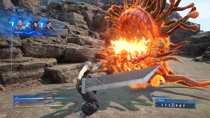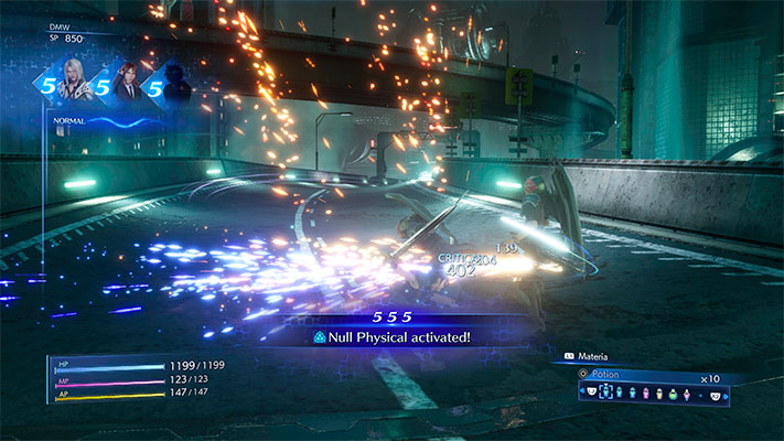 Crisis Core -Final Fantasy VII- Reunion est un Action-RPG avec un gameplay prochaine de Final Fantasy VII Remake mais avec quelques originalités. Manette en main, on peut donc attaquer via le bouton carré, esquiver avec la croix, se protéger avec R1 et utiliser jusqu’à 6 matérias via le bouton L1 combiné avec d’autres boutons. (Ex: L1 + carré ou L1 + R2). Pour utiliser un objet en combat (notamment une potion en cas de coup dur) vous pourrez faire défiler les différents objets avec les touches L2 et R2 et ainsi le sélectionner avec la touche cercle. Comme dans sa version d’origine, les combats ont une petite notion de chance avec l’ONC (Onde Cérébrale Numérique), une sortie de « Jackpot » qui vous sortira des séries de chiffres qui pourront vous être bénéfique pendant le combat en vous octroyant des avantages ou même des altération d’état.