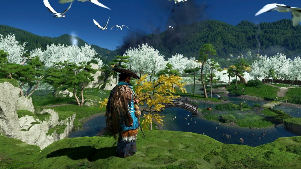 Si Tsushima respirait la chaleur et les rizières dorées, Yotei te plonge dans un Japon nordique, dominé par le Mont Yōtei et ses aurores boréales. C’est sublime. Les cerisiers dans la neige, les reflets sur les lames, les couchers de soleil glacés… chaque plan est une estampe vivante. La PS5 crache ses tripes, et on en redemande.