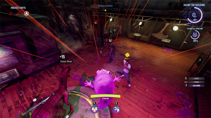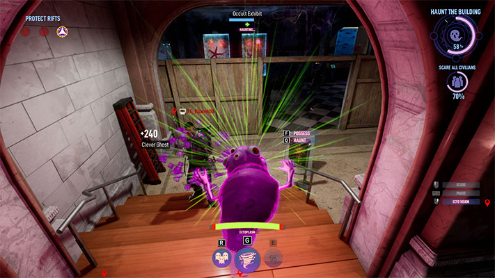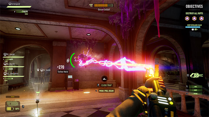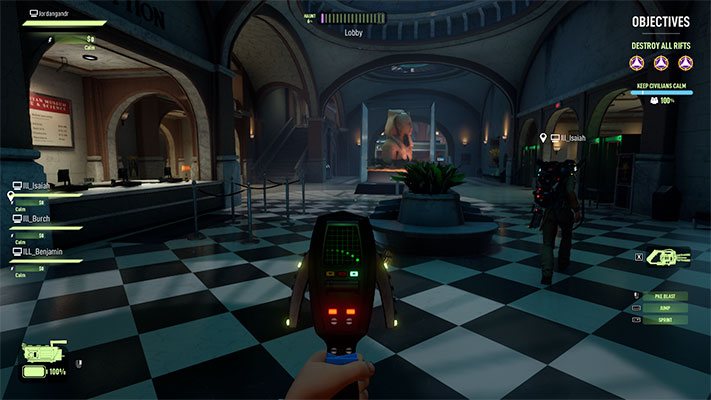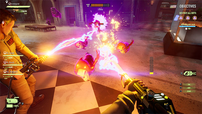 Les règles du jeu sont simples, accompagné de trois autres « casseurs de fantômes » vous devez « nettoyer » les lieux de tous ses habitants nuisibles. Mais ce ne sont pas des rats que vous devez chasser mais des spectres qui ont la particularité de pouvoir passer à travers les murs, prendre possession d’objet ou encore vous engluer. Les fantômes peuvent effrayer les PNJ qui peuplent la map, vous aurez également pour mission de les rassurer pour continuer tranquillement votre mission, car si le taux de peur des PNJ atteint les 100% c’est le Game Over pour vous et le fantôme aura gagné. Les fantômes s’infiltrent dans les lieux à travers des failles interdimensionnelles que vous devrez détruire pour éviter que les revenant popent. Une fois les failles détruite et le fantôme capturé la mission est finie et vous récolterez de l’XP en récompense.
