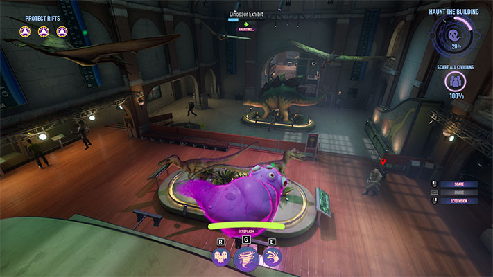 Et qui dit jeu asymétrique dit « jouer le méchant » également. Vous aurez donc la possibilité d’incarner le fantôme et vous mesurer aux Ghostbusters. Côté gameplay, votre rôle sera d’effrayer les PNJ pour faire monter la barre de hantise tout en esquivant les chasseurs de fantômes. Vous pourrez prendre possession d’un objet pour vous déplacer plus discrètement mais il faudra surtout protéger les trois failles interdimensionnelles qui vous permettent de revenir sur la map après avoir été capturé.