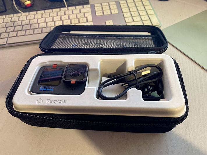 La caméra est livrée avec son étui rigide, une batterie Enduro, une fixation adhésive, une boucle de fixation, une vis ainsi que son cable USB-C. Bien évidemment la fixation de la caméra reste identique donc tous vos anciens accessoires seront compatible excepté les coques de plongée qui diffèrent en fonction du modèle.