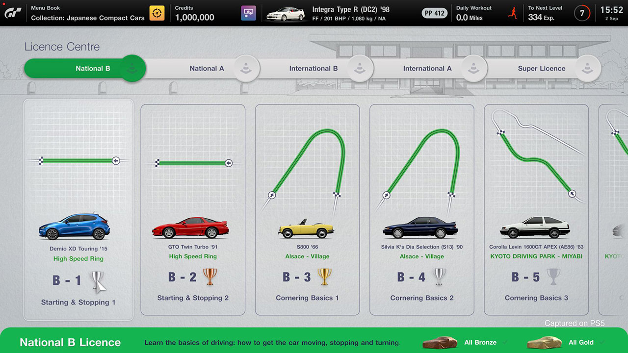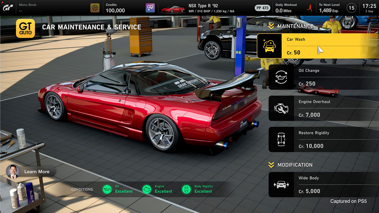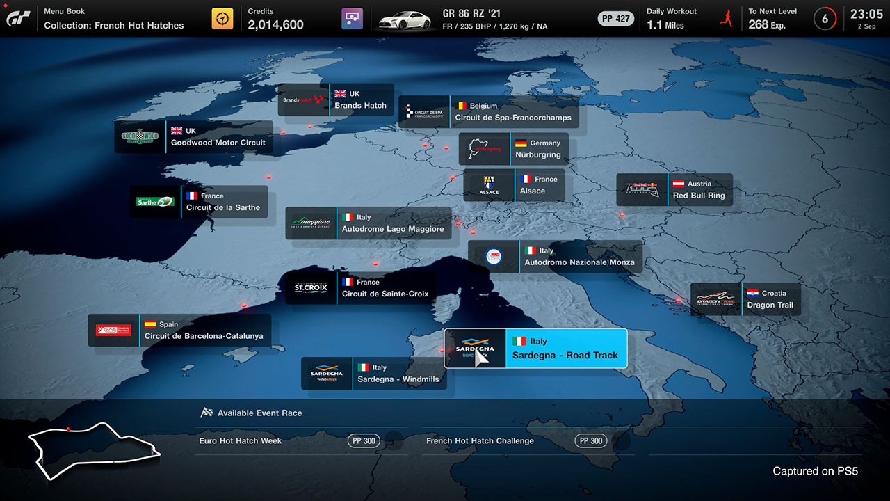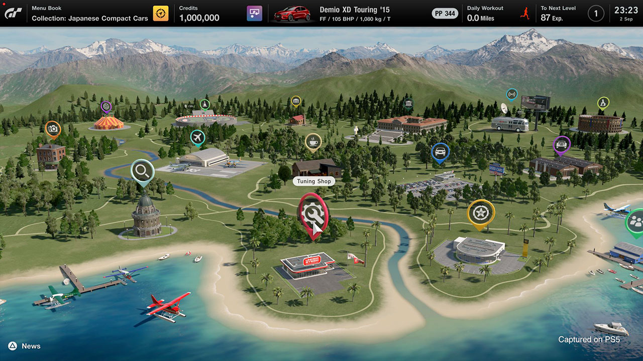 Gran Turismo c’est un peu la déclaration d’amour de Kazunori Yamauchi, et on le sent dans l’intro du jeu. On y découvre des images d’archives revenant sur la création des premières automobiles jusqu’à nos jours sous un air de la légendaire chanson de la saga, Moon over the castle. Le menu sous forme de carte est bien évidemment de retour avec des points d’intérêts tels que votre garage, le centre des permis, la concession d’occasions, le Brand Central pour les voitures neuves ou encore les circuits mondiaux. Mais l’un des plus interessant n’est autre que le Gran Turismo Café, un lieu très apaisant où vous trouvez une liste de défis à relever sous forme de menus. Ces défis vous rapporteront argent, véhicules, circuits et même des tickets de roulette. Cette roulette vous offrira également argent, véhicules et bien d’autre récompenses.