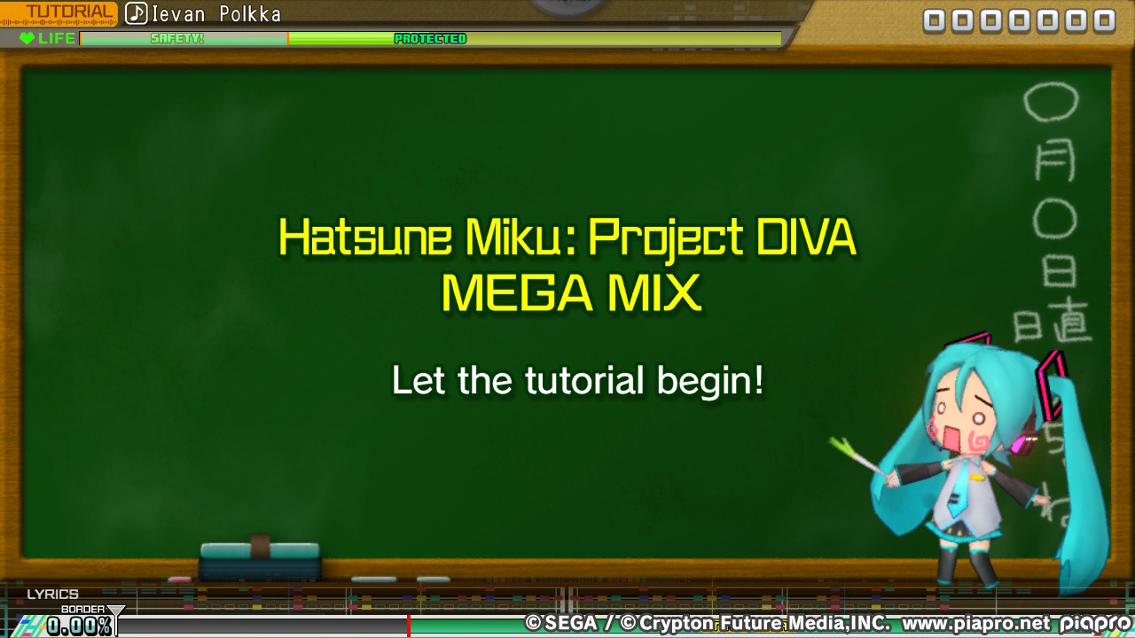 Avant de commencer, un tutoriel est lancé afin de prendre le logiciel en main. Il est particulièrement bénéfique pour les joueurs qui débutent sur les jeux de rythme. Si le tutoriel est assez classique (explication une à une pour chaque touche, puis les options, comme le maintien de touches), il est présenté de manière ludique et fun. On retrouve Hatsune Miku en avatar chibi, avec son célèbre poireau en main, telle une maîtresse débutante devant son tableau en ardoise.