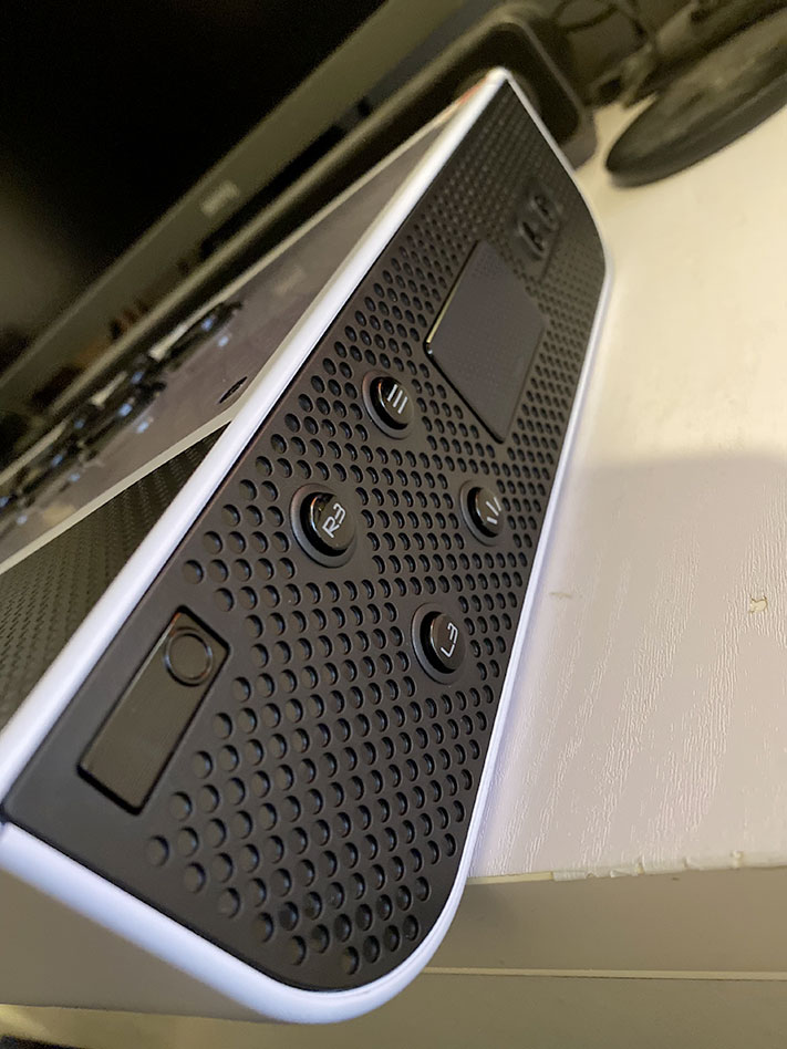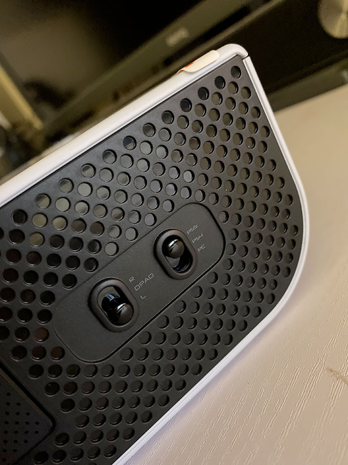 Cette compatibilité se règle via un bouton sur le côté de l’appareil. Manette oblige un port casque à l’avant est également proposé pour les joueurs équipés d’écouteurs filaires. Sur la dessus, on peut y voir donc le stick (interchangeable entre deux types), ainsi que les touches principales (carré, croix, cercle, triangle) accompagnées des boutons « gachettes » (L1, R1, L2, R2). A savoir que les boutons L3 et R3 sont accessibles sur le côté droit tout comme les boutons Options, Share et le pavé tactile faisant office de bouton « Start » pour certains jeux de combats ou Shmup rétro.