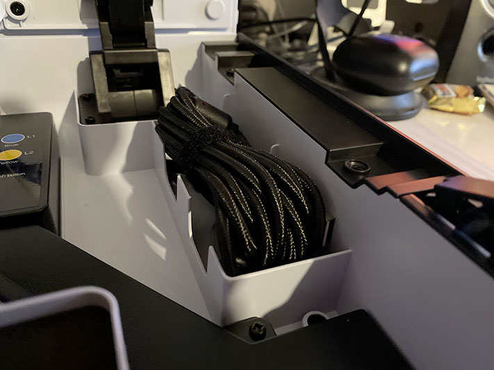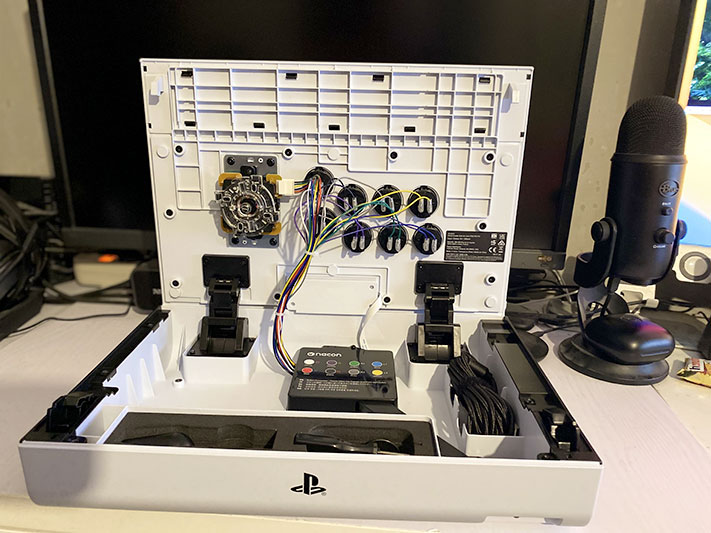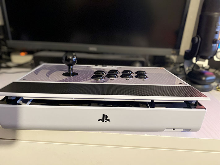 Les boutons « PlayStation » mais également la sélection de profil se trouve sur le dessus avec des leds indiquants la position ainsi que le profil du joueur (jusqu’à 4). Ce profil est paramétrable via une application très pratique et qui vous permettra de configurer votre stick sans avoir à passer par le mapping manuel en soulevant le capot. Le capot s’ouvre via deux « clips » sur les côtés de l’appareil.