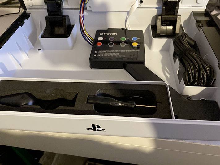 A l’intérieur vous trouverez le cable de connexion USB-C (plutôt long), ainsi qu’un tournevis et un « mediator » pour mapper votre stick à votre convenance. Un second stick est également disponible pour votre confort de jeu.