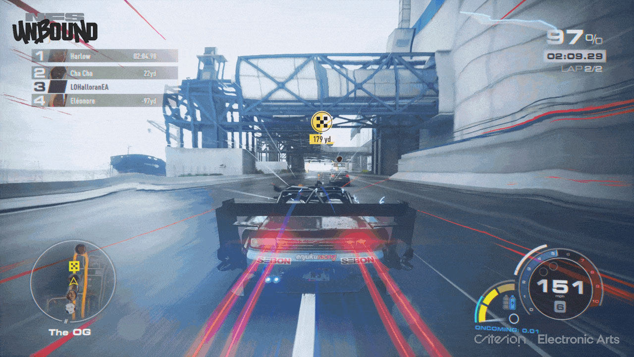 Graphiquement l’esthétique des véhicules et les décors sont superbes. On ressent le travail du studio dans un environnement full next-gen sans la contrainte d’une développement en deux temps. Cependant, il y a deux choses qui nous choquent, le charadesign et les effets styles graffitis durant les courses. Autant le charadesign est visible uniquement pendant les cinématiques, les effets graffitis sont vraiment too much et beaucoup trop présents. De plus, il vous est impossible de les désactiver. La seule solution est de choisir un style particulier qui atténue les effets mais ils restent visibles. Les styles cohabitent assez mal.