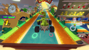 La prise en main est rapide et totalement calée sur Mario Kart. On accélère, on freine (ou pas), on dérape, on attrape des items et on les lance sur les ennemis. Classique, Simple, Basique… vous avez les bases (OK je sors…) ! Le soucis vient du fait que la conduite est lente et terriblement ennuyeuse. Les circuits ont beau proposer des divergences de terrains comme des phases aquatiques ou aériennes, voir même des changements de parcours. On s’ennuie…