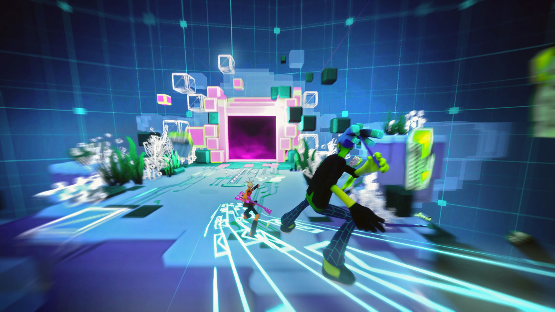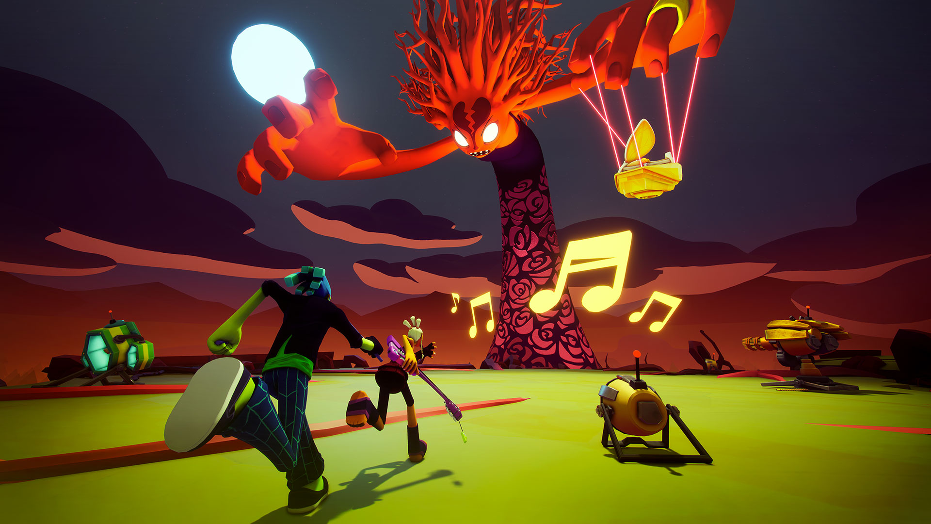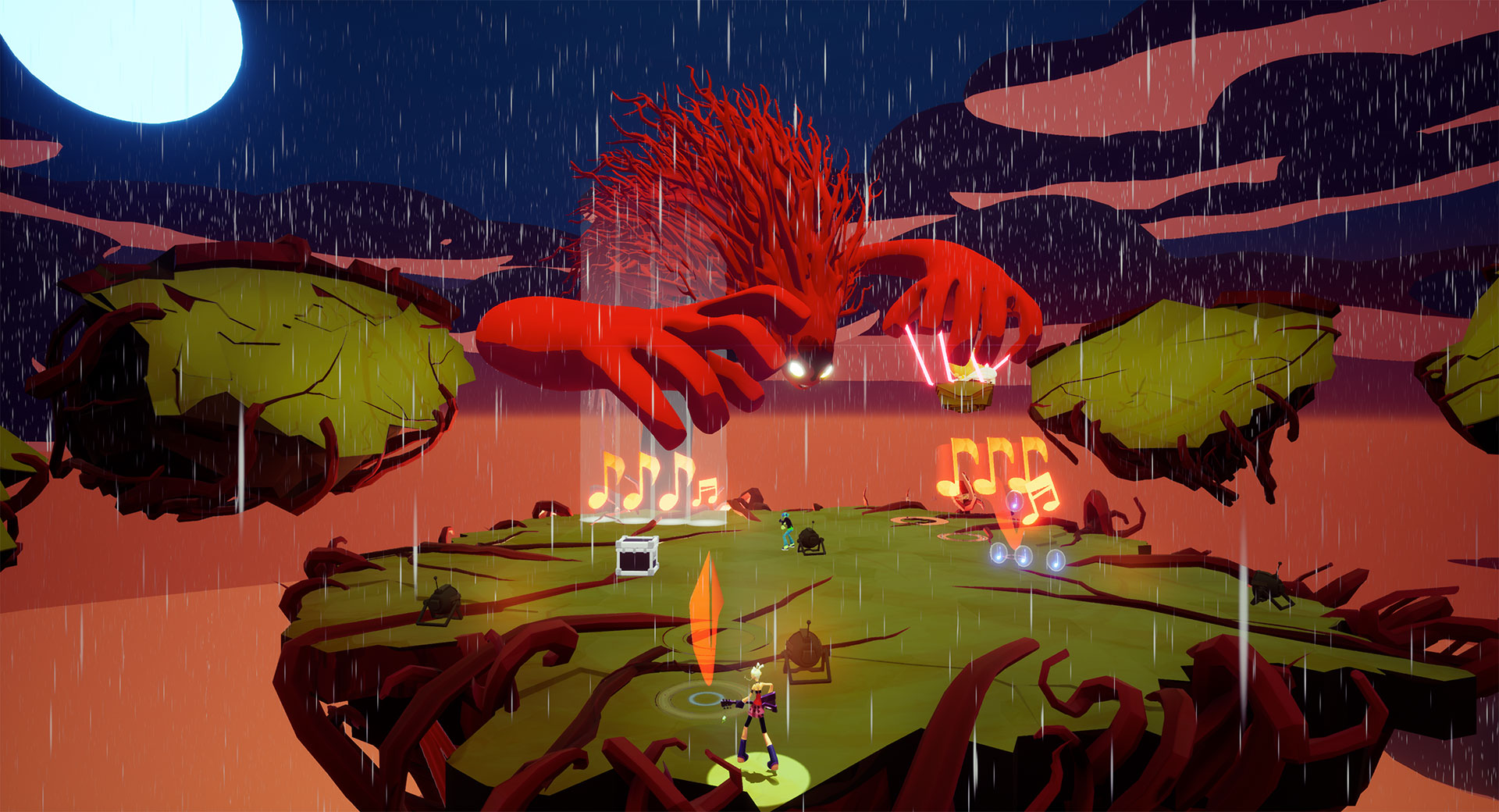 Manette en main, le titre s’apparente à un Kingdom Hearts dans ses mécaniques de base, à savoir un bouton pour frapper, un saut, une roulade… un grand classique. Un autre bouton est utilisé pour déclencher certains éléments du décors qui actionneront des armes temporaires, ouvriront des portes ou des téléporteurs. Les gâchettes servent principalement à lancer les projectiles (des notes de musique), utiliser des attaques personnalisées ou tout simplement switcher dans chacun des deux héros si vous jouez en solo.