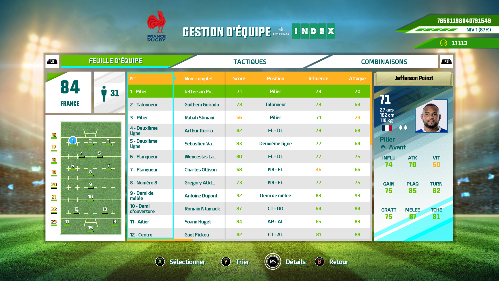 Le jeu nous propose plusieurs modes de jeu, le plus simpliste étant le mode « match direct » où vous pourrez choisir parmi toutes les équipes connu du Top 14, de la Pro D2 pour nous Français, Gallagher Premiership pour l’Angleterre et sans oublier bien sur les équipes Nationales qui sont pour la plupart présentes. Nous avons dit la plupart, car oui certaines équipes Nationales sont disponibles mais le jeu n’ayant pas les licences officielles des noms et maillots, il manque donc les vrais joueurs des équipes d’Angleterre, de l’Afrique du sud et surtout de nos chers amis les All Blacks de Nouvelle Zélande, ce qui est quand même très fâcheux pour un jeu de rugby quand on connait le palmarès de ces équipes dans la vraie vie. Cela peut malheureusement laisser un gout amer quand on est fan de rugby et que l’on aime se faire un bon « Crunch » comme on dit entre notre cher XV de France et le XV de la rose de nos chers amis Anglais.