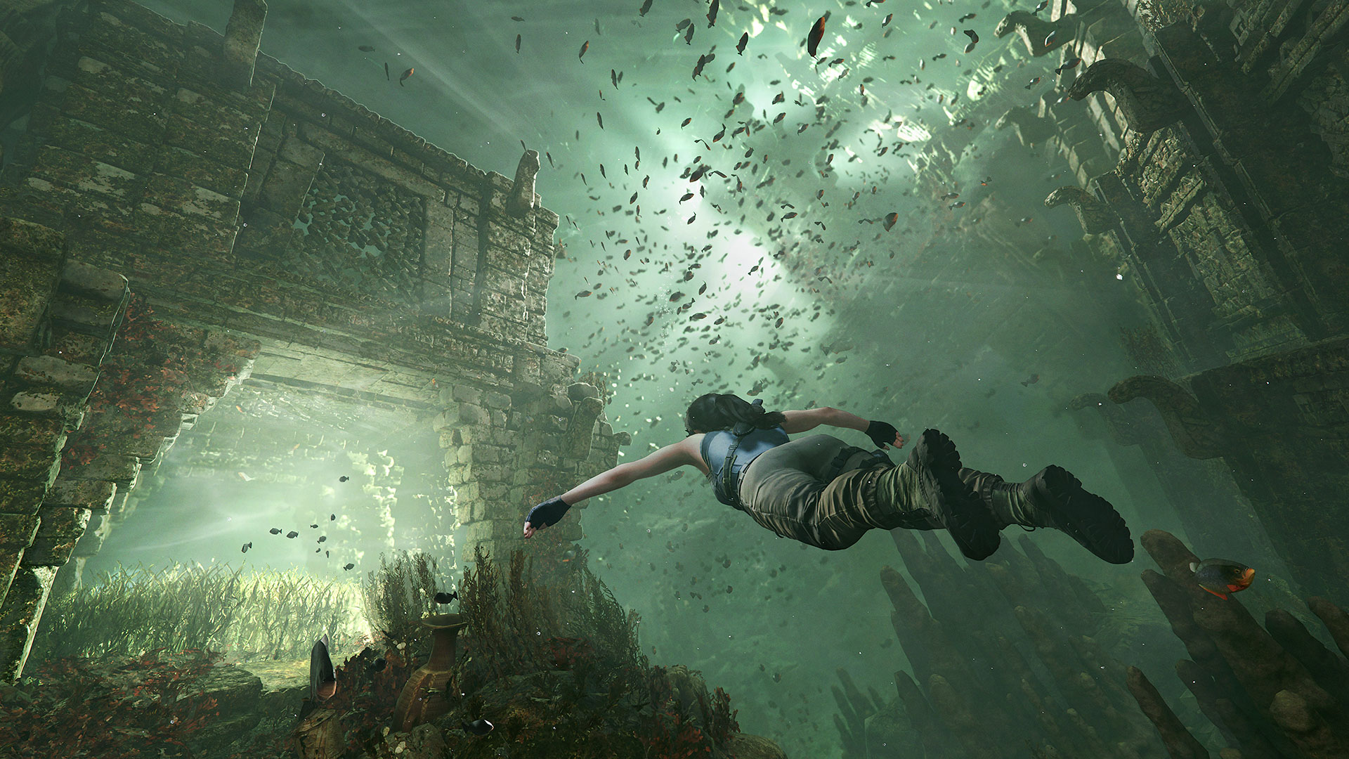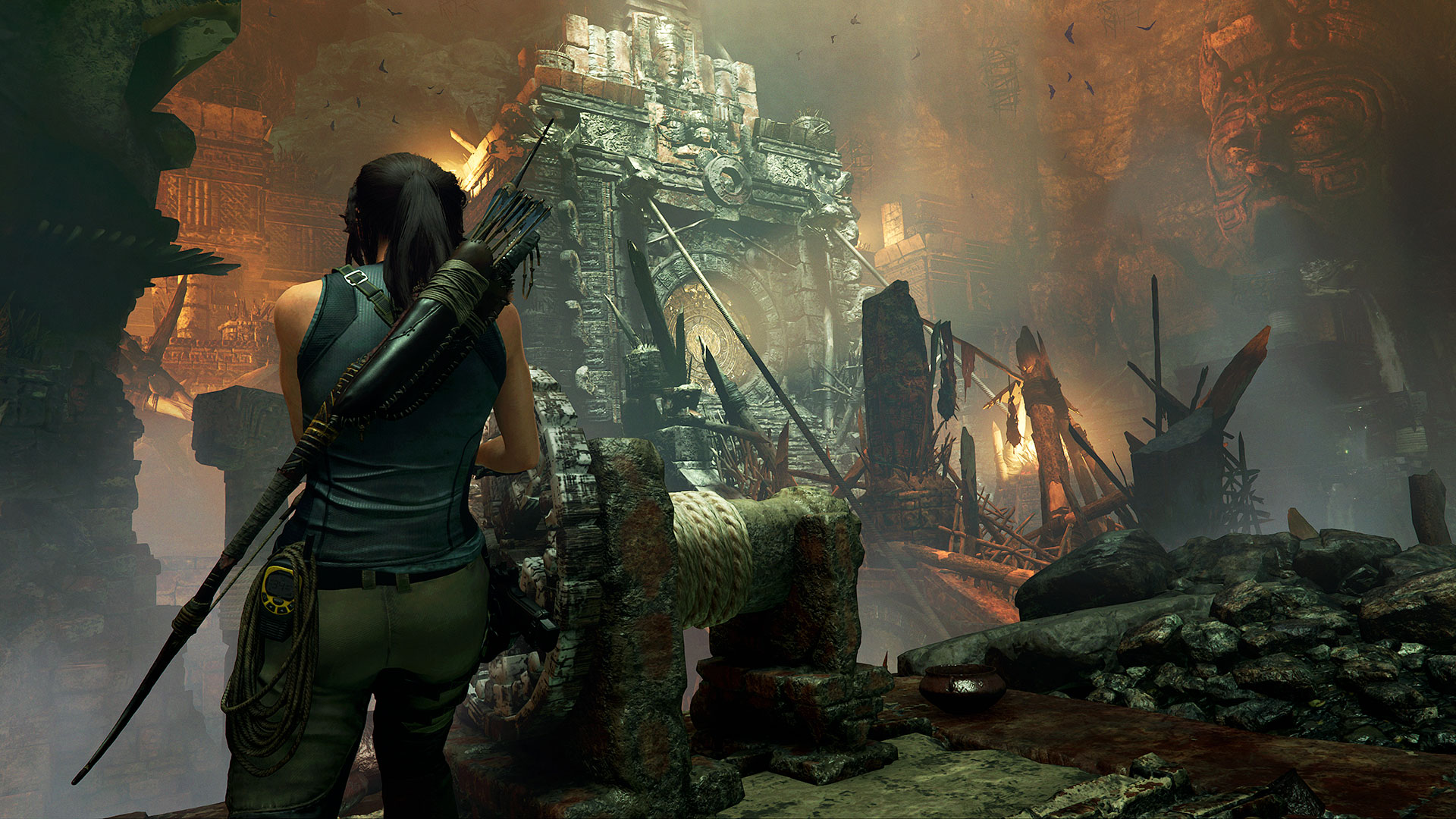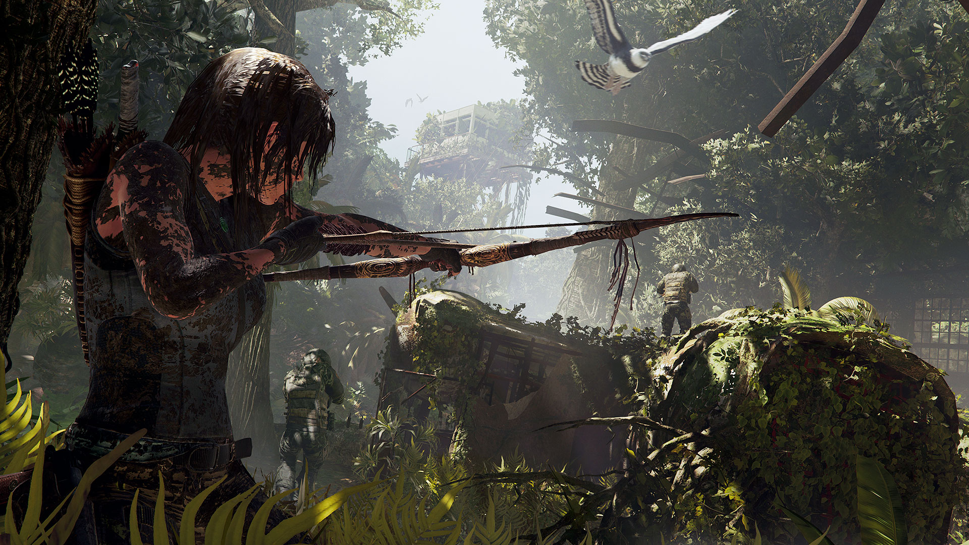 Côté Gameplay, Shadow of The Tomb Raider reprend l’essentiel de ces deux ainés en y ajouter une bonne partie d’infiltration. Lara a désormais la capacité d’être furtive, que ce soit en se cachant dans les murs de lierre, dans les hautes herbes, dans l’eau ou tout simplement en se badigeonnant de boue pour un effet camo miliaire. La descente en rappel s’ajoute aussi aux compétences de la jeune aventurière. Ces petites nouveautés ne sont pas sans rappeler un certain Uncharted, qui lui-même s’inspirait des premiers Tomb Raider… On a beau être un maitre, l’élève peut toujours nous en apprendre. A noter qu’il y a beaucoup plus de séquences sous marines, celle-ci était d’ailleurs assez oppressante rendant très bien côté sonorité. Il faut donc bien gérer son temps avec des poches d’airs pour respirer et des hautes algues pour éviter les murènes et les bancs de Piranhas. Même si cet opus fait la part belle à la furtivité et à l’exploration, les combats sont toujours présents mais se font rares. Il est toujours aussi grisant de décocher une flèche en plein dans la tête d’un ennemi mais l’essentiel est de rester discret.