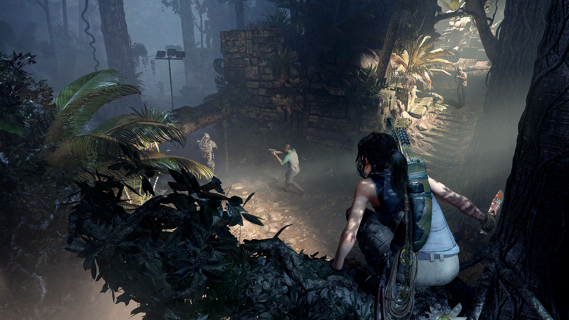 Côté Gameplay, Shadow of The Tomb Raider reprend l’essentiel de ces deux ainés en y ajouter une bonne partie d’infiltration. Lara a désormais la capacité d’être furtive, que ce soit en se cachant dans les murs de lierre, dans les hautes herbes, dans l’eau ou tout simplement en se badigeonnant de boue pour un effet camo miliaire. La descente en rappel s’ajoute aussi aux compétences de la jeune aventurière. Ces petites nouveautés ne sont pas sans rappeler un certain Uncharted, qui lui-même s’inspirait des premiers Tomb Raider… On a beau être un maitre, l’élève peut toujours nous en apprendre. A noter qu’il y a beaucoup plus de séquences sous marines, celle-ci était d’ailleurs assez oppressante rendant très bien côté sonorité. Il faut donc bien gérer son temps avec des poches d’airs pour respirer et des hautes algues pour éviter les murènes et les bancs de Piranhas. Même si cet opus fait la part belle à la furtivité et à l’exploration, les combats sont toujours présents mais se font rares. Il est toujours aussi grisant de décocher une flèche en plein dans la tête d’un ennemi mais l’essentiel est de rester discret.
