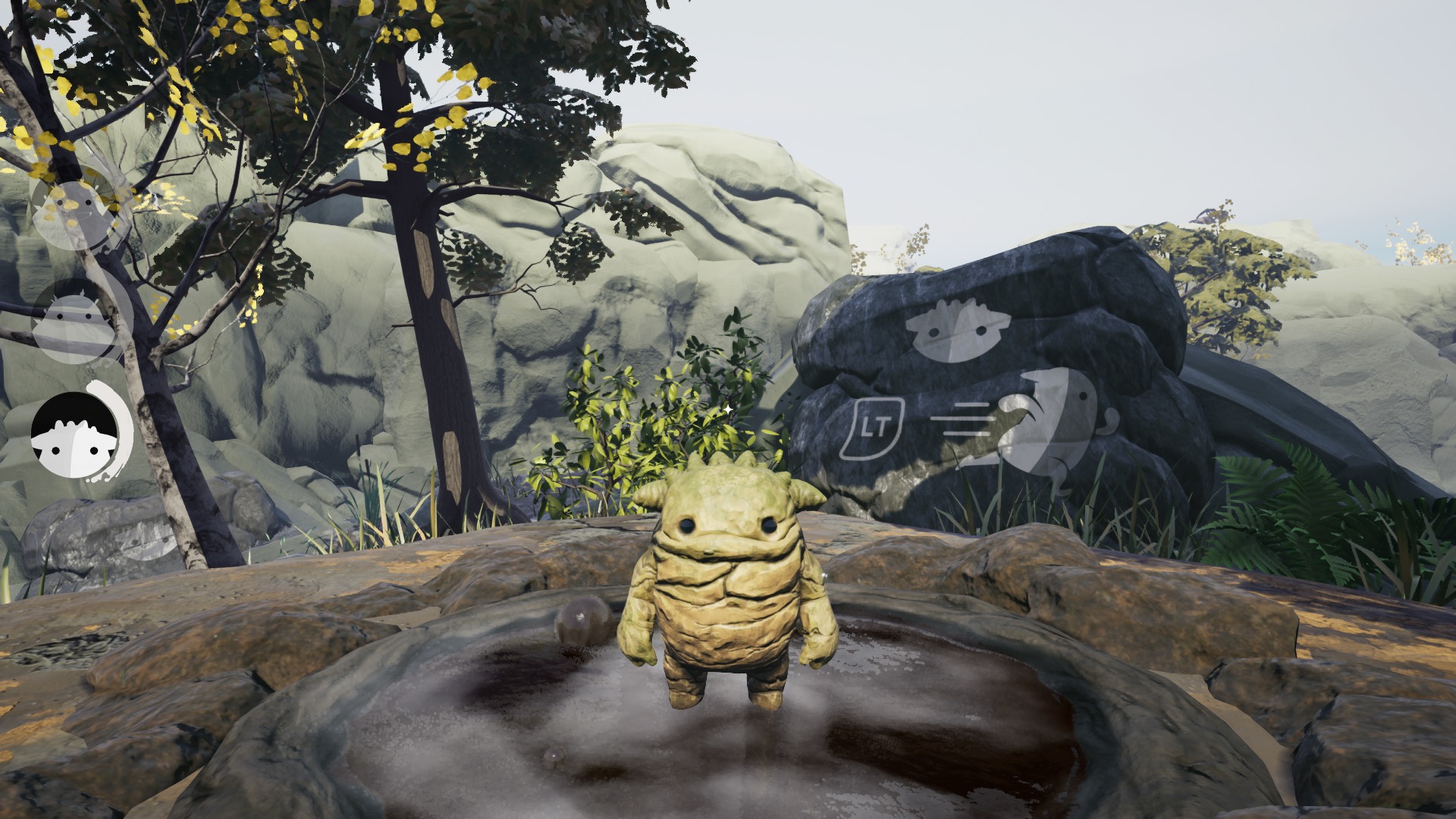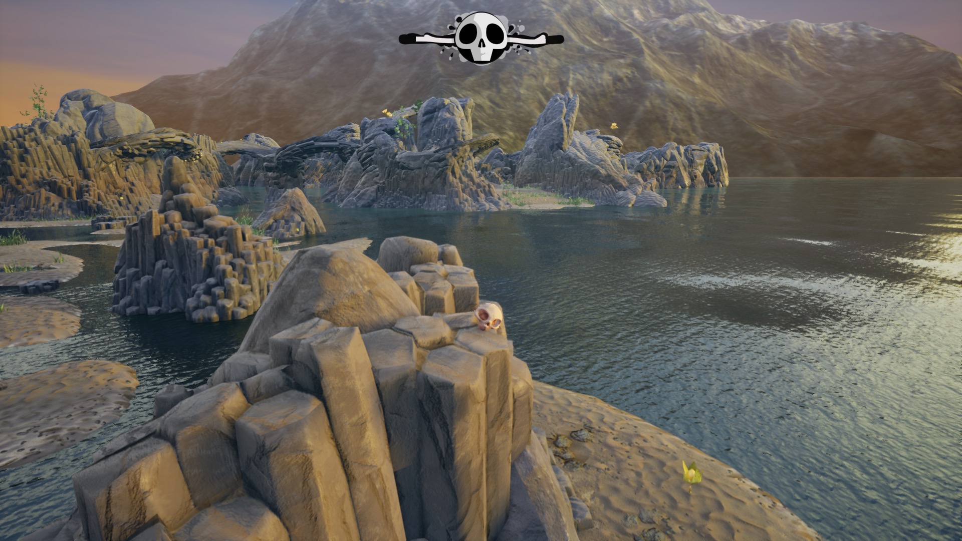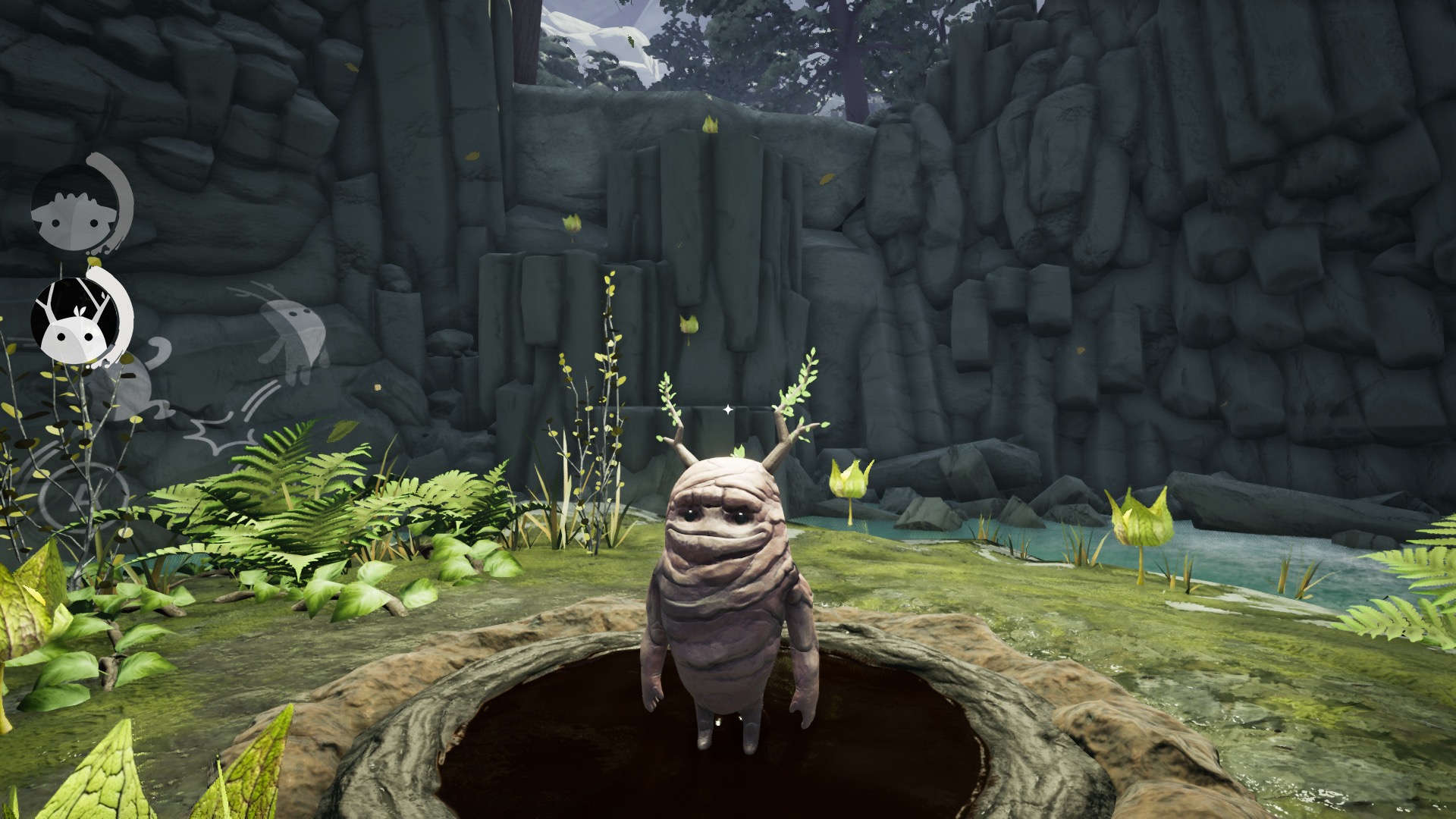 Une fois la première cinématique passée, débute la découverte de l’île du haut de notre petit crâne. La prise en main est assez rapide : deux possibilités de déplacement pour commencer : la roulade et le saut. Et découverte de notre premier ennemi : l’eau ! Et oui, le crâne ayant été ressuscité grâce à l’argile, tout liquide devient notre nemesis principale ! Plus tard, de nouveaux ennemis font évidemment leur apparition, comme les voyous d’eau et de lave, les lianes des marais…