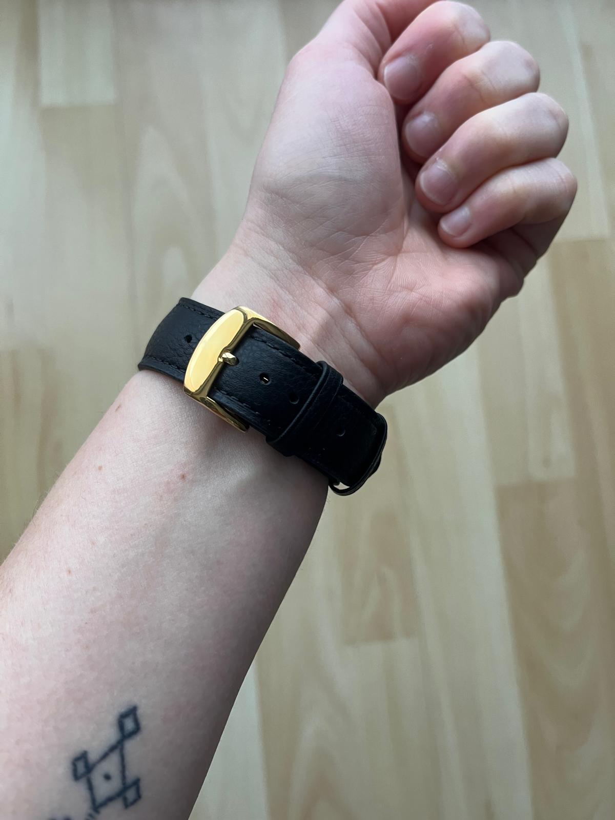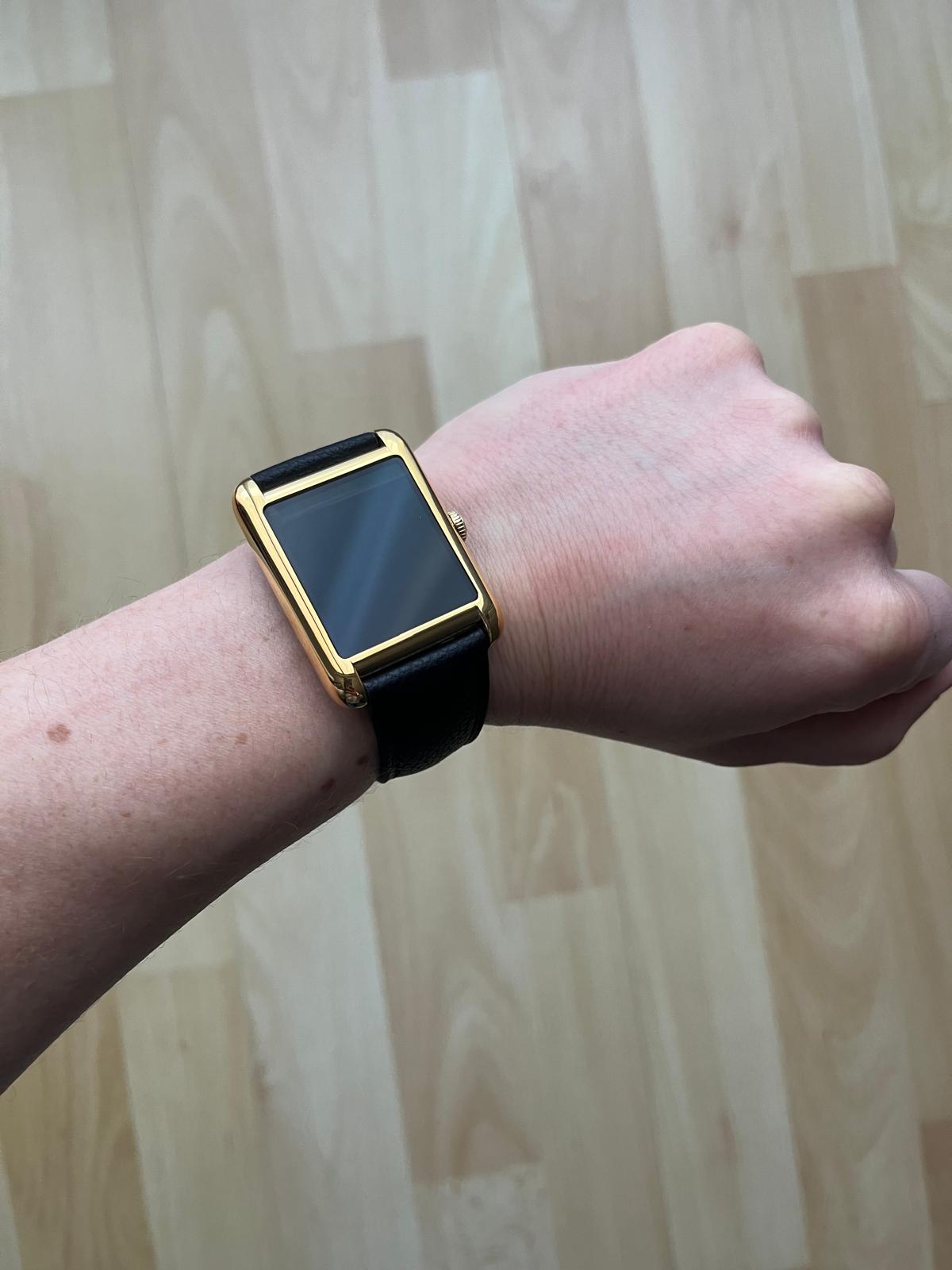 Le boîtier, rectangulaire, est doré, très élégant, et rappelle les montres classiques haut de gamme. Le bracelet en cuir noir façon grain croco lui donne un côté chic, mais aussi raffiné et sérieux. Son style est pensé pour ceux qui aiment une montre connectée sans sacrifier l’élégance : assez discrète pour le boulot, assez précieuse pour une tenue plus habillée.