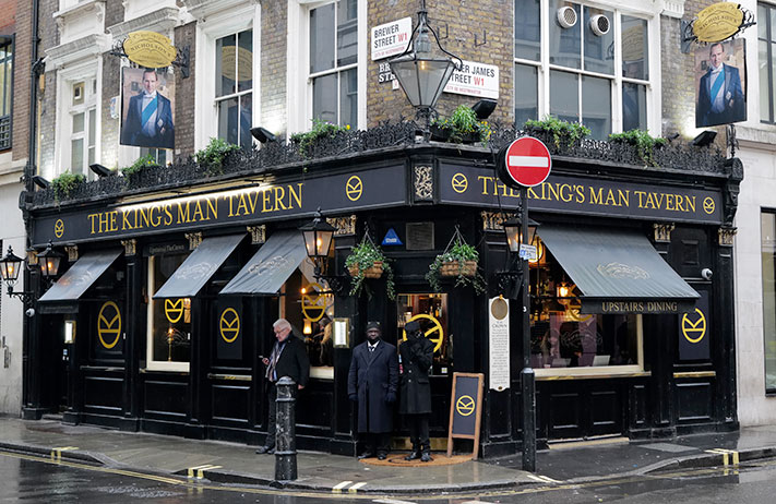 Ralph Fiennes, Gemma Arterton et Harris Dickinson, de même que le réalisateur Matthew Vaughn, sont arrivés dans la capitale britannique quelques heures plus tôt, inaugurant ainsi le pub « The King’s Man » de Soho, qui ouvre ses portes au public à partir d’aujourd’hui. Cette séance photos sur place n’était qu’une partie des festivités qui ont eu lieu à Londres tout au long de la journée d’hier à l’occasion du lancement du film. C’est ainsi qu’une assemblée d’hommes et de femmes fringants, revêtus de la tenue iconique des Kingsmen et coiffés d’un chapeau melon, ont convergé de tous les coins de Londres pour rejoindre l’équipe du film à ce pub. D’autres activités voyaient quant à elles le fameux symbole « K » de la saga projeté sur quelques sites remarquables, tels le London Eye ou l’académie royale militaire de Sandhurst.