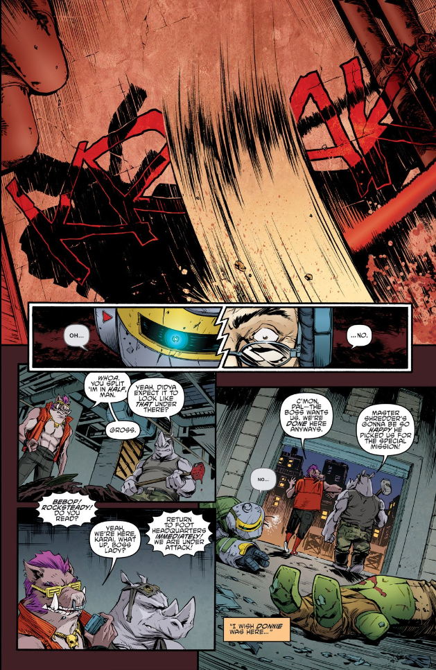 C’est donc dans le numéro 44 de la série Teenage Mutant Ninja Turtles, écrit par Tom Waltz et Kevin Eastman, que l’on apprend le décès d’une des quatre tortues. C’est Donatello qui décède de la main de Rocksteady. Alors que Leonardo, Raphael, et Michelangelo tentent d’empêcher Krang de « terraformer » la Terre à l’aide du Technodrome, Donatello supervise les opérations depuis leur base avec Metalhead. Attaqué par Bebop et Rocksteady, Donatello et Metalhead tentent de faire face mais sans succès. Ci-dessous quelques pages du comic en question. C’est la première fois dans le comic qu’une tortue trépasse. Même si on sait très bien que dans les comics, les héros ne meurent jamais.