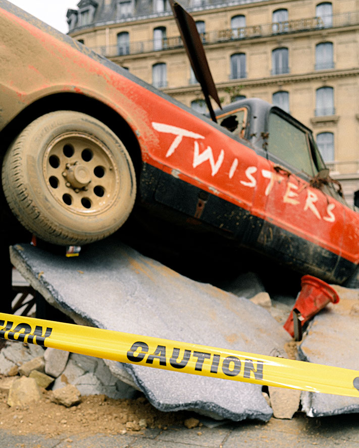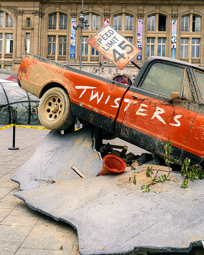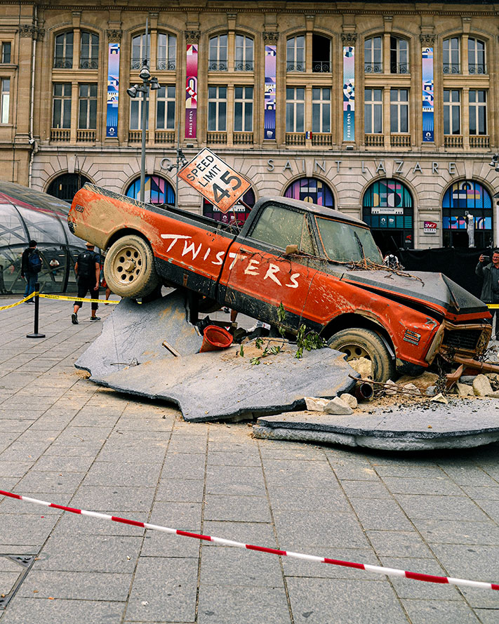 Un pick-up américain a été emporté par la force des tornades et s’est encastré sur le parvis de la gare Saint-Lazare. Cette installation, conçue pour surprendre et captiver les passants, nous plonge dans l’univers de TWISTERS en plein cœur de la capitale française.