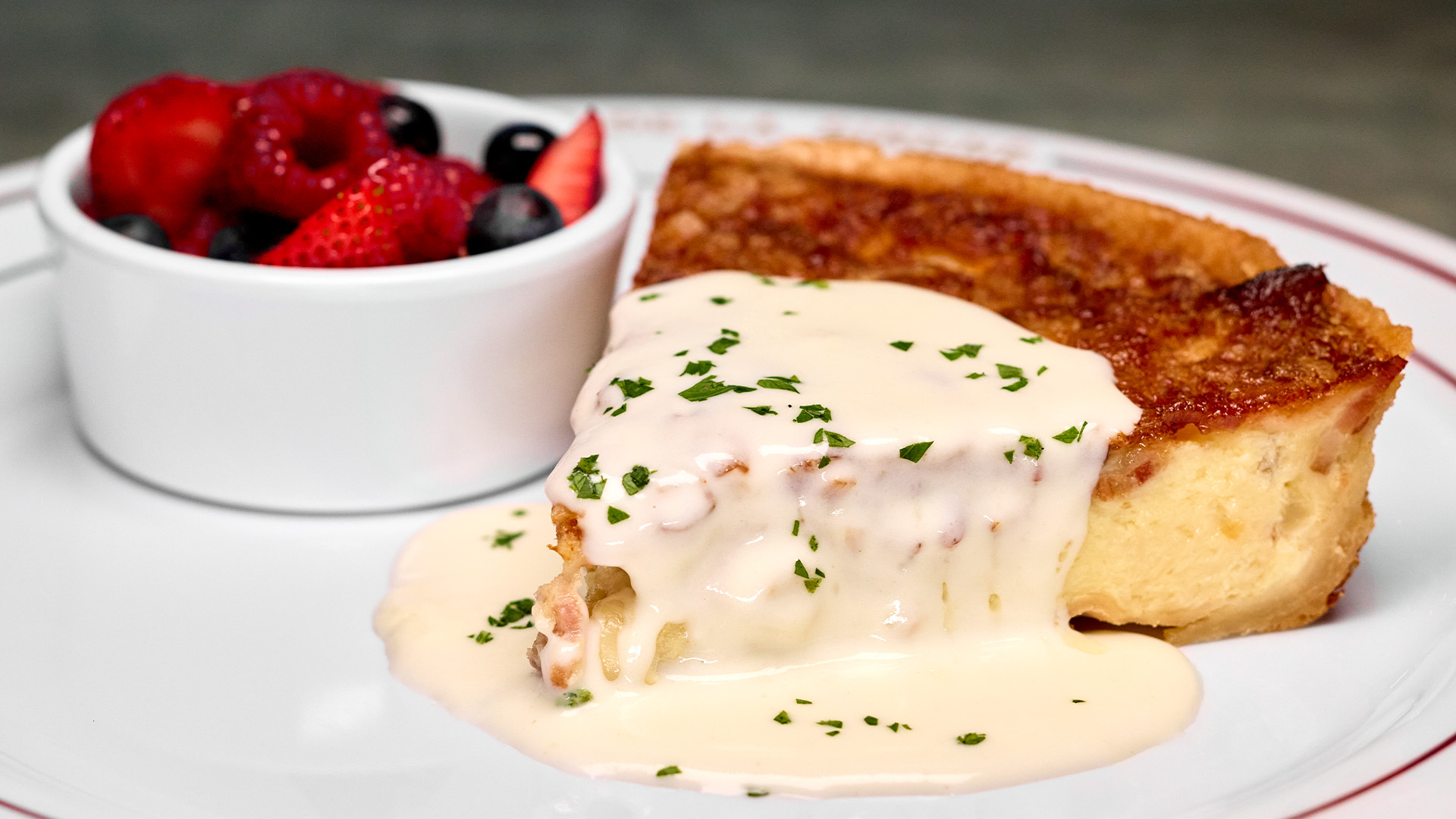- Quiche Lorraine (Café L’air De La Sirène) – un plat salé comprenant une crème aux œufs cuite dans une croûte à tarte feuilletée remplie de bacon croustillant, de gruyère et d’oignons caramélisés avec une sauce mornay, et un côté de baies fraîches garni d’un filet de miel de lavande